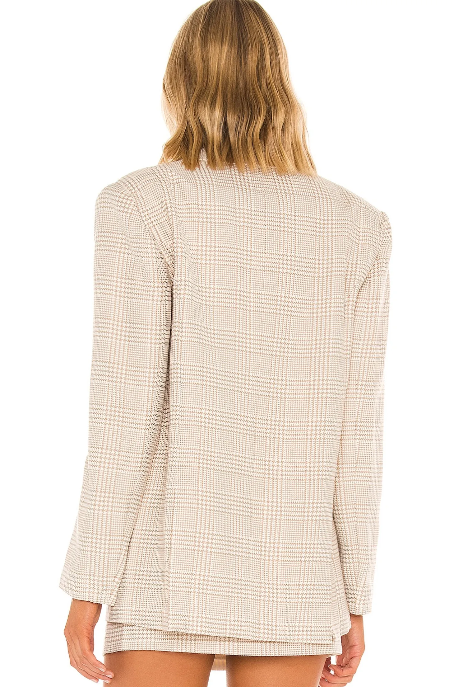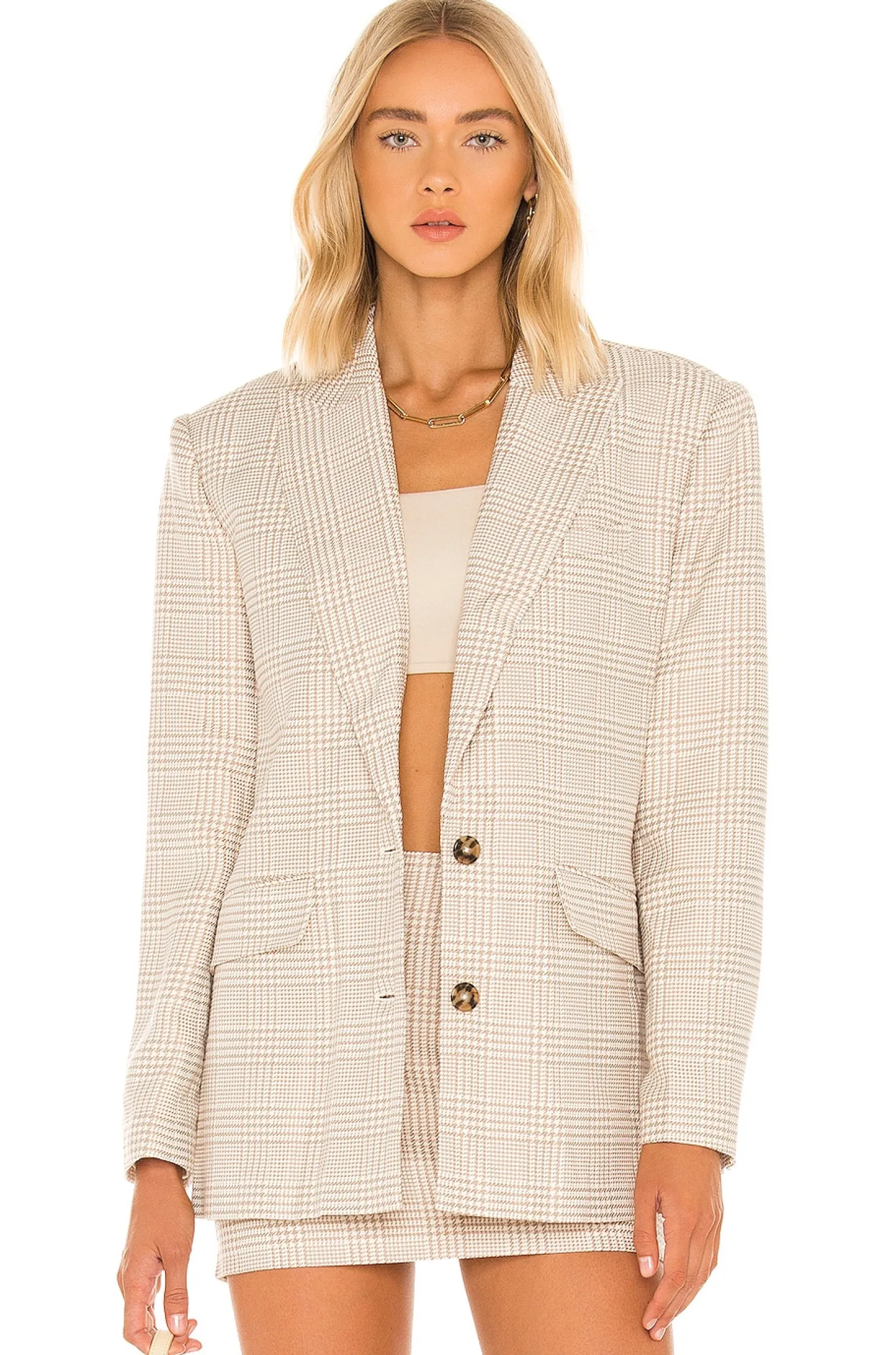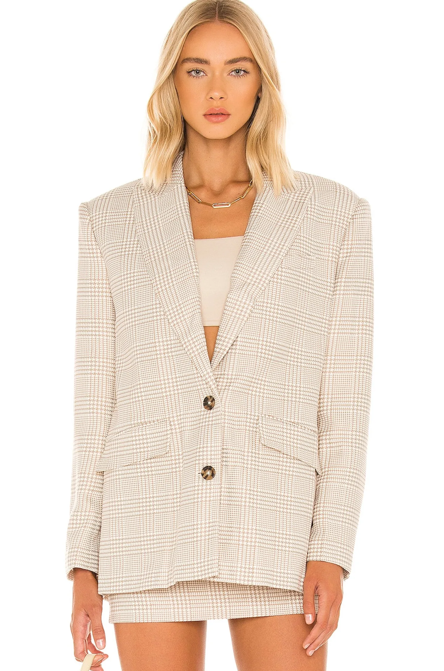 Self: 60% poly 35% rayon 5% elastane Lining: 55% poly 45% rayon.Made in China.Hand wash.Partial front button closure.Breast pocket and side flap pockets.Padded shoulders.Back vent.Item not sold as a set