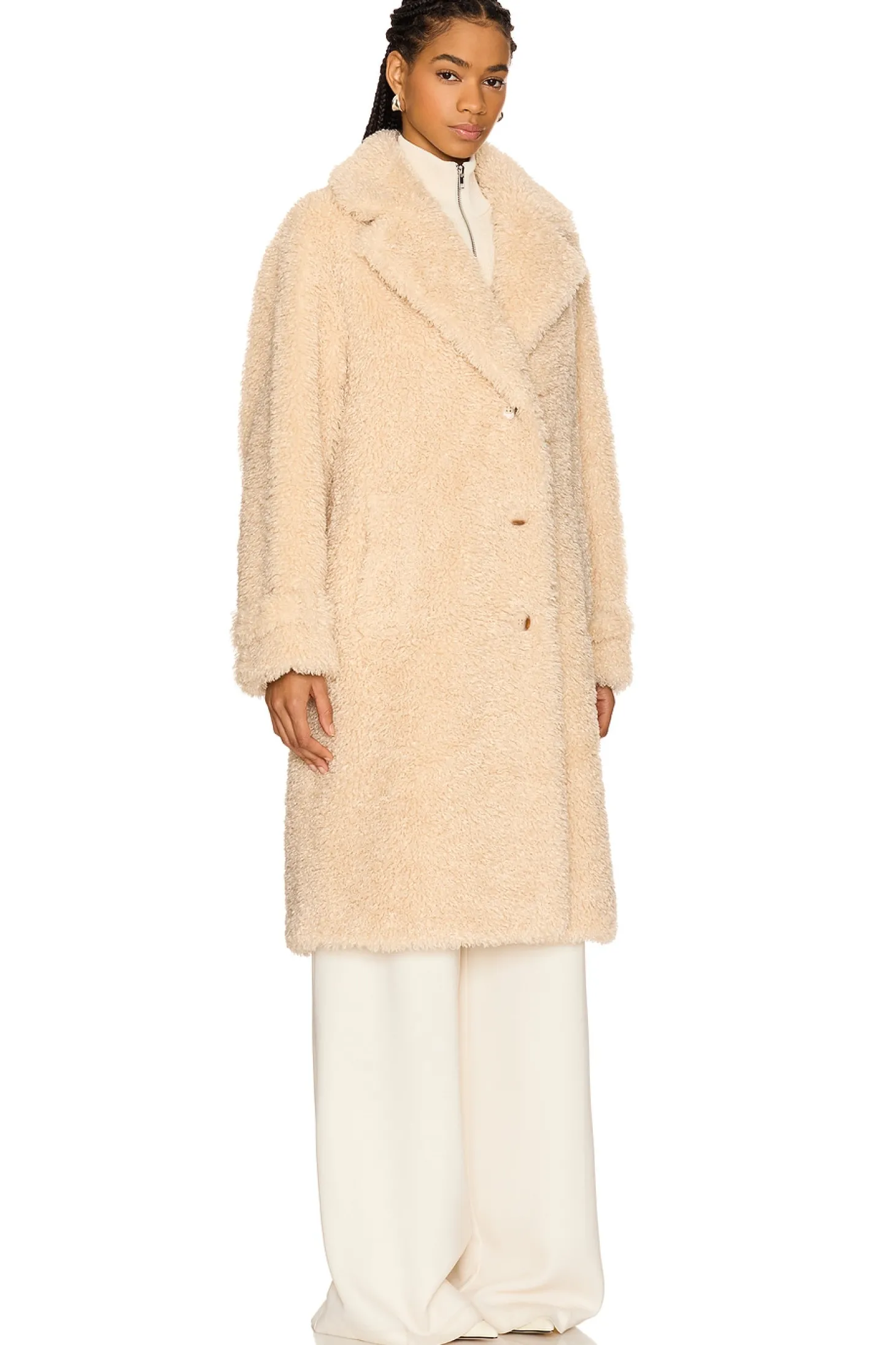 Self & Lining: 100% polyester.Made in China.Dry clean only.Front button closure.Side seam pockets and adjustable buckle cuffs.Heavyweight faux fur fabric with notched lapel collar