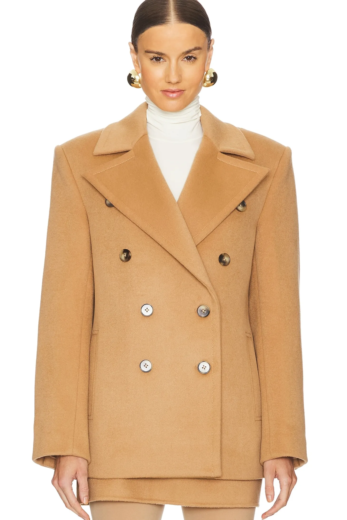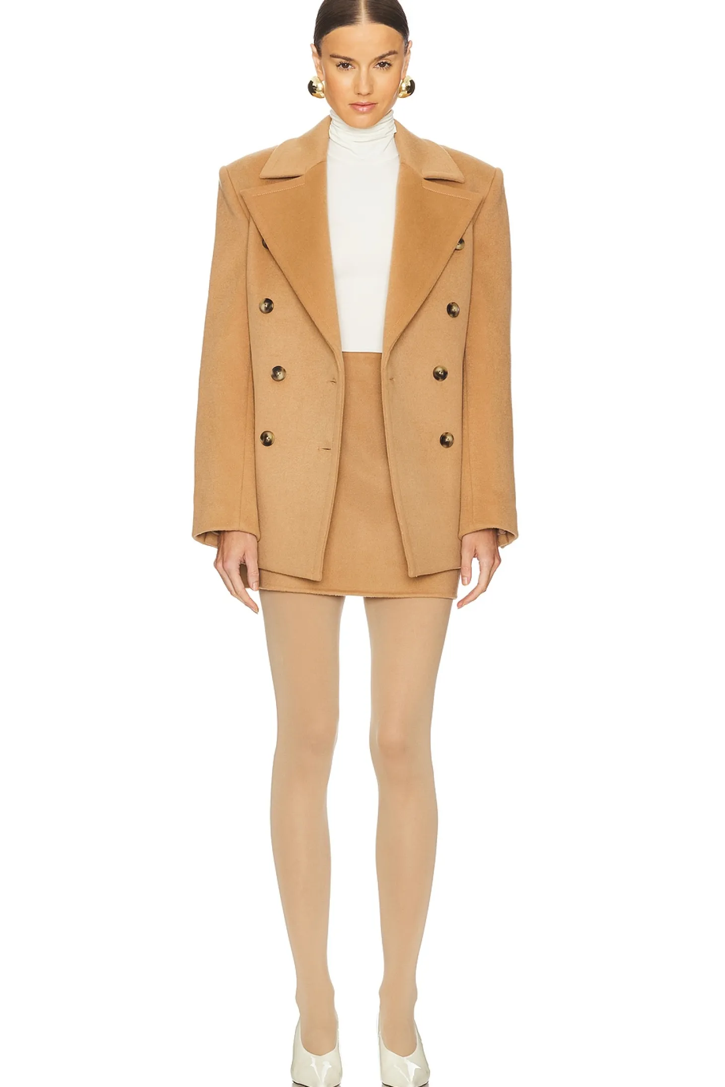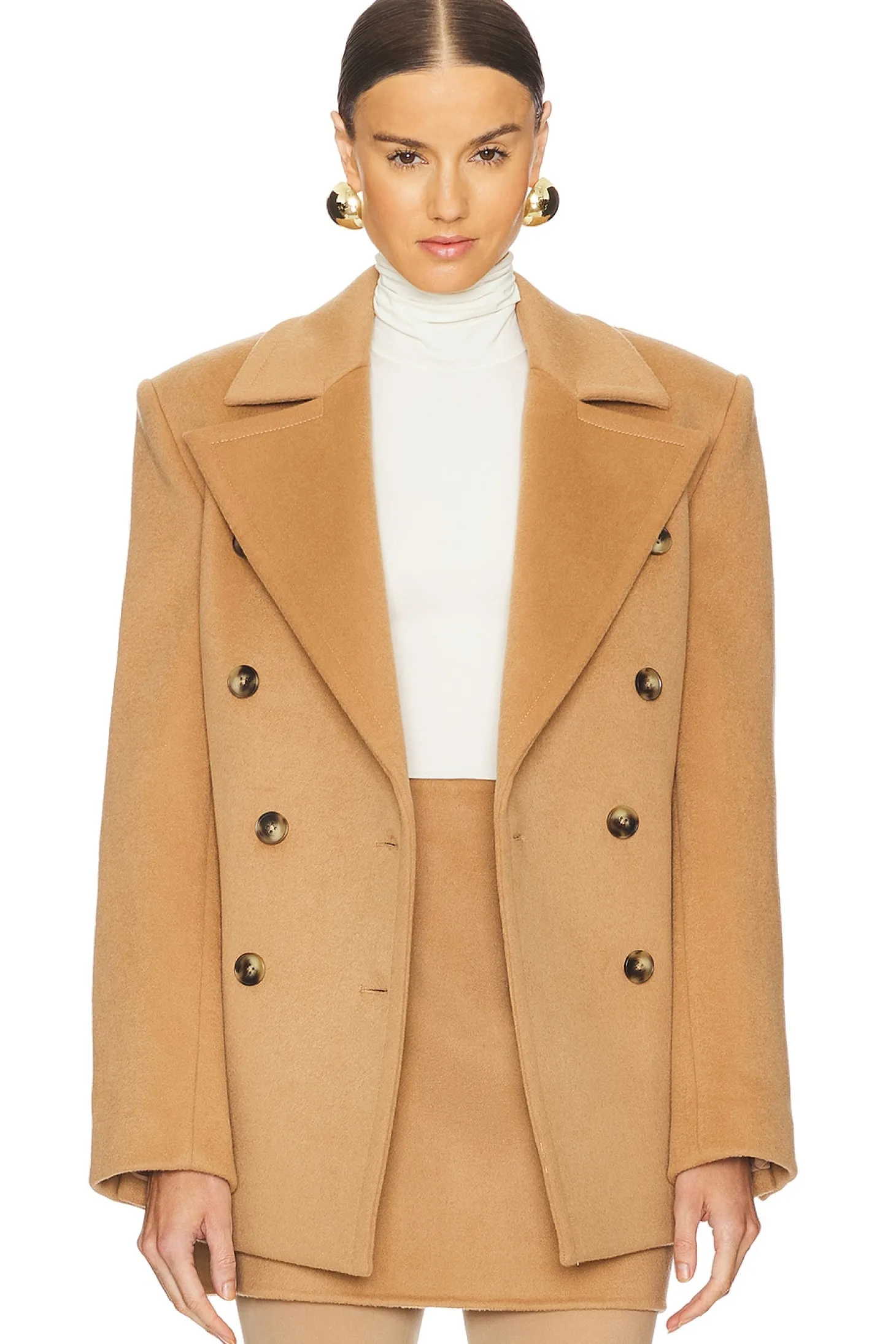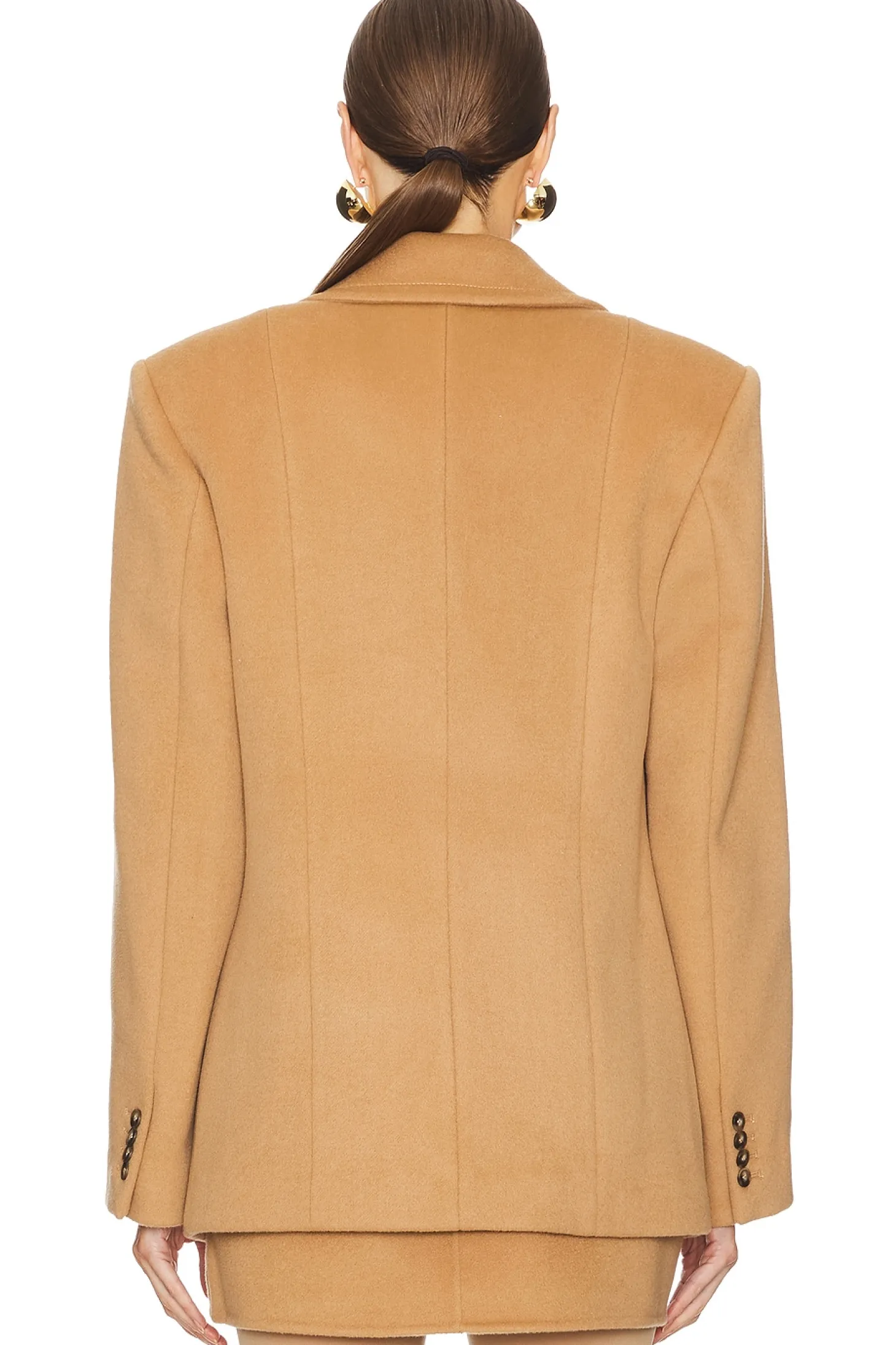 Self: 100% wool Lining: 100% polyester.Made in China.Dry clean only.Double breasted closure.Side pockets.Faux buttoned cuffs.Melton fabric with padded shoulders.Item not sold as set