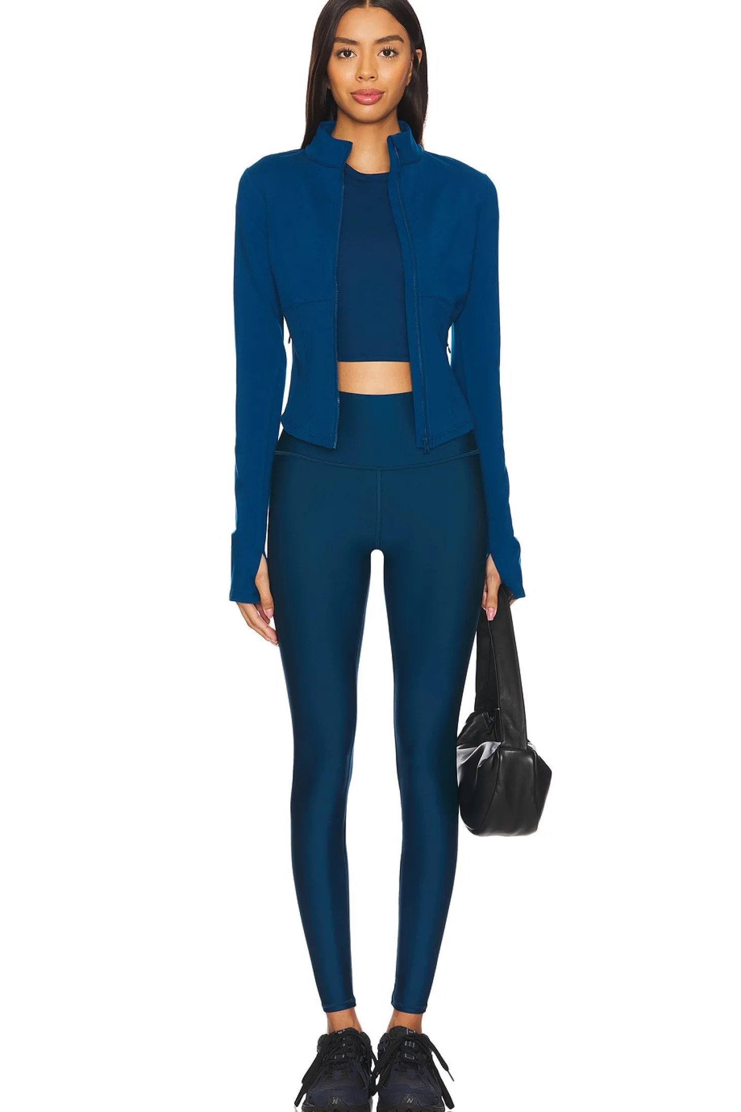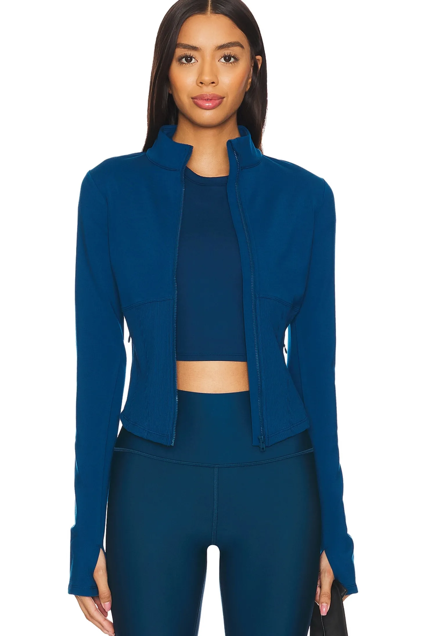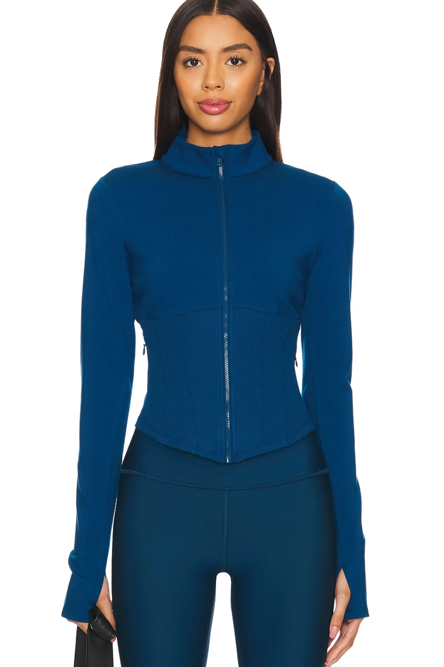 Self: 81% polyester 19% elastane Contrast Fabric: 90% polyester 10% elastane.Made in Vietnam.Machine wash.Exposed front zipper closure.Mockneck and thumbhole design.Stretch jersey fabric.Item not sold as set