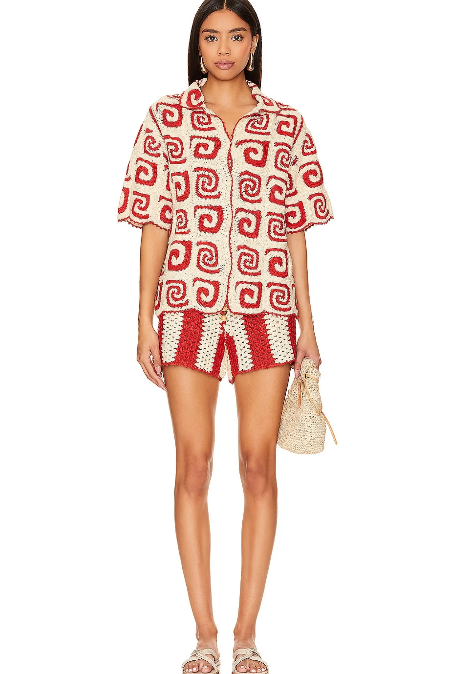 100% cotton.Made in India.Dry clean only.Drawstring closure.Midweight open crochet fabric.Shorts measure approx 12.5" in length