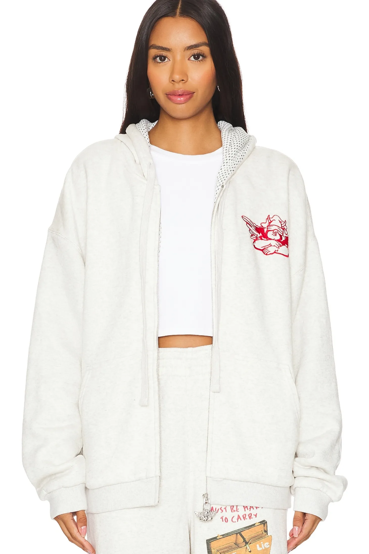 Self: 66% cotton 21% rayon 13% polyester Lining: 74% polyester 25% rayon 1% spandex.Made in China.Machine wash.Hidden front zip closure.Front pockets and drawstring hood.Elastic cuffs and hem.French terry interior with embroidered logo and back graphic.Item not sold as set