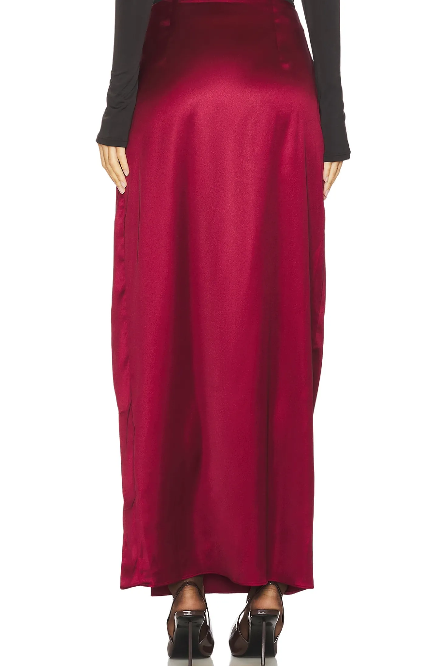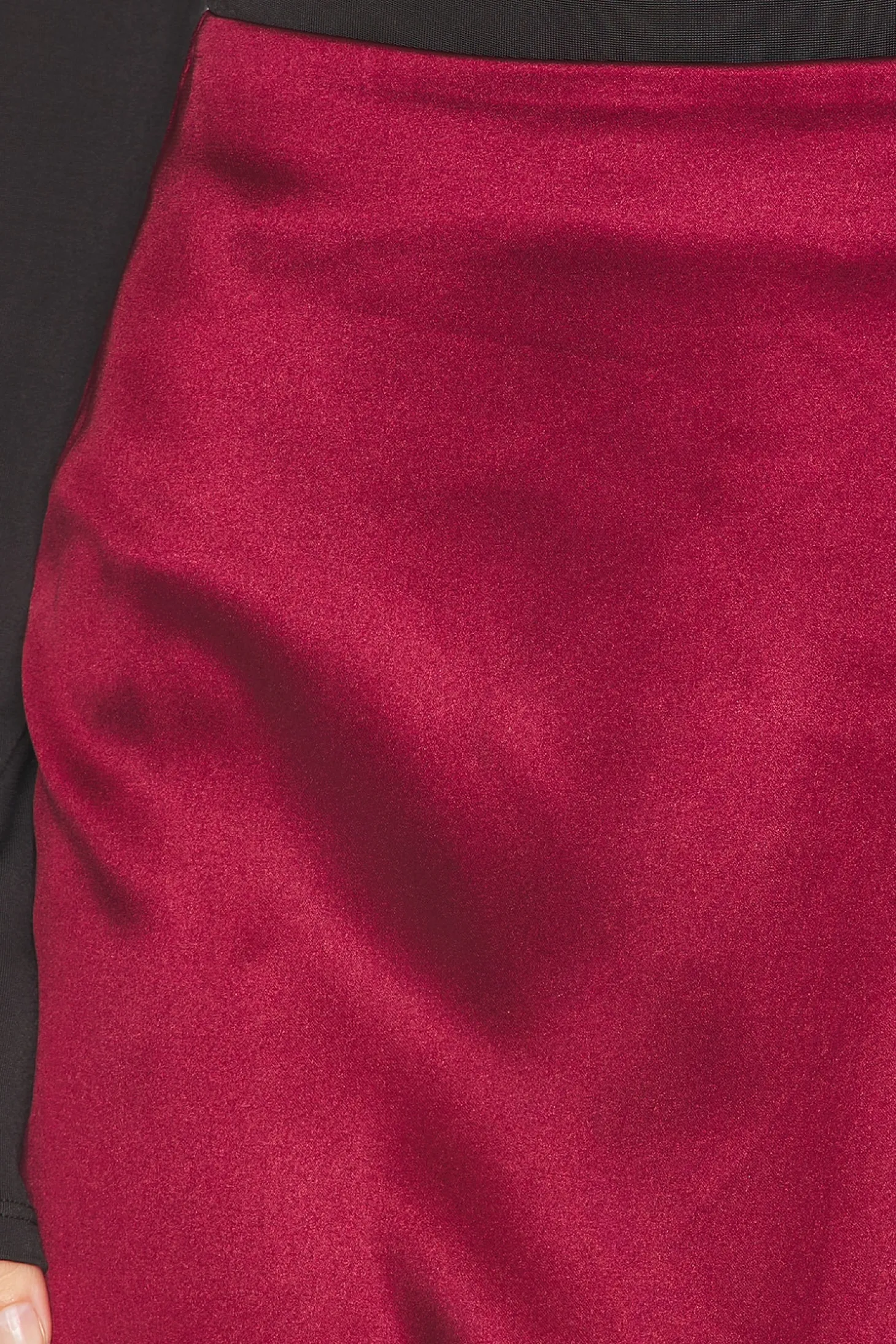 97% polyester 3% spandex.Made in China.Dry clean.Unlined.Hidden side zipper closure.Lightweight satin fabric with side slit.Skirt measures approx 40" in length