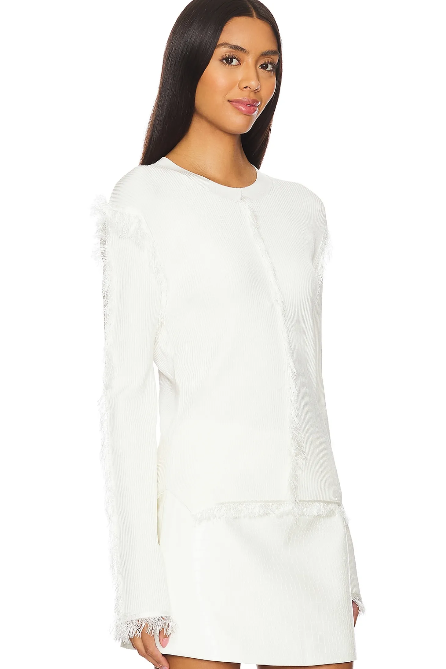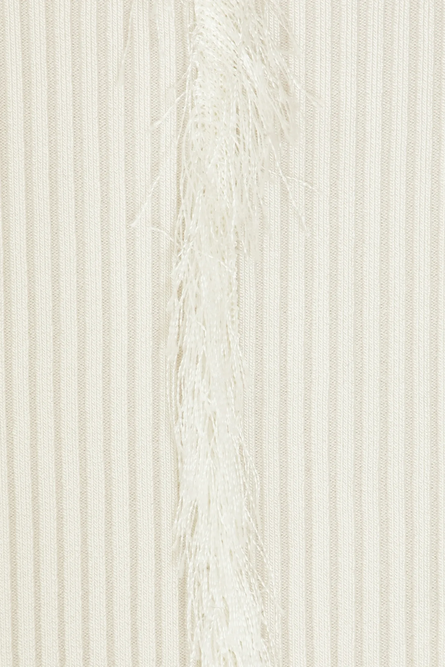 75% rayon 23% nylon 2% spandex.Made in China.Dry clean only.Pull-on styling.Ribbed jersey with fringe trim.Item not sold as set