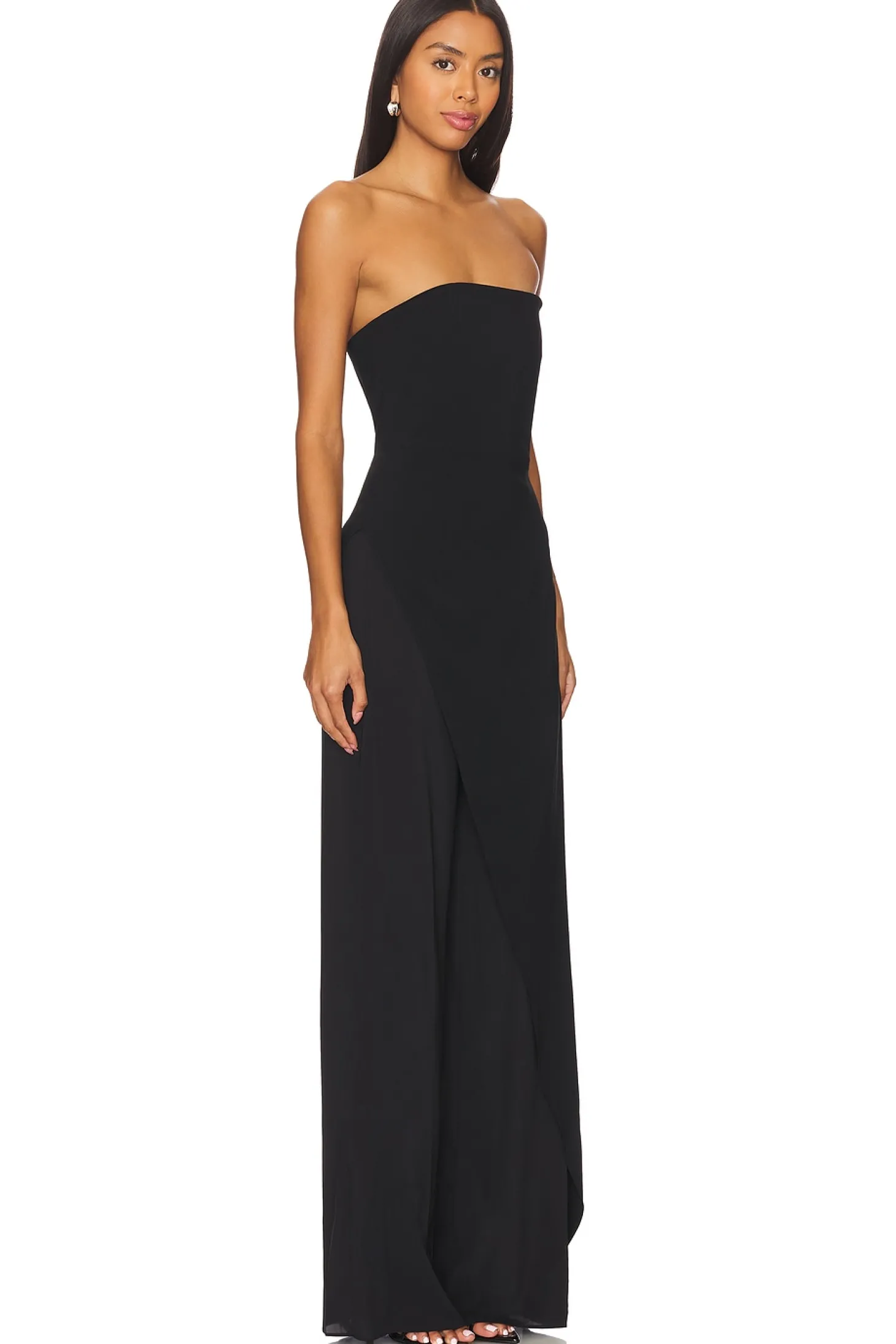 Self: 64% recycled polyester 33% polyester 3% elastane Combo: 95% polyester 5% elastane Lining: 95% recycled polyester 5% elastane.Made in China.Dry clean only.Hidden side zip closure.Boned bodice.Crepe fabric.Neckline to hem measures approx 54" in length 21" at the knee breaks to 24" at the leg opening