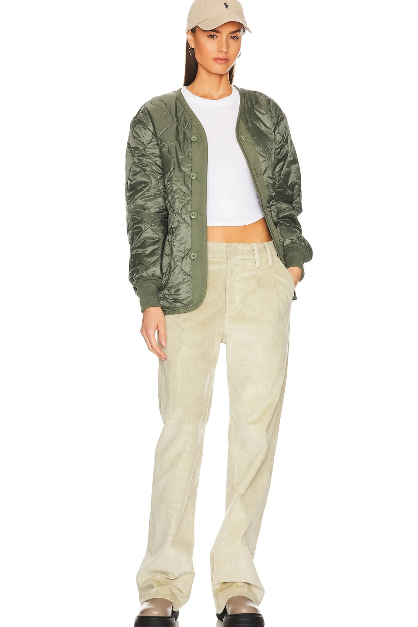 Self & Lining: 100% nylon Filling: 100% poly Knit: 99% poly 1% spandex.Imported.Button front closure.Front patch pockets.Rib knit cuffs.Quilted fabric