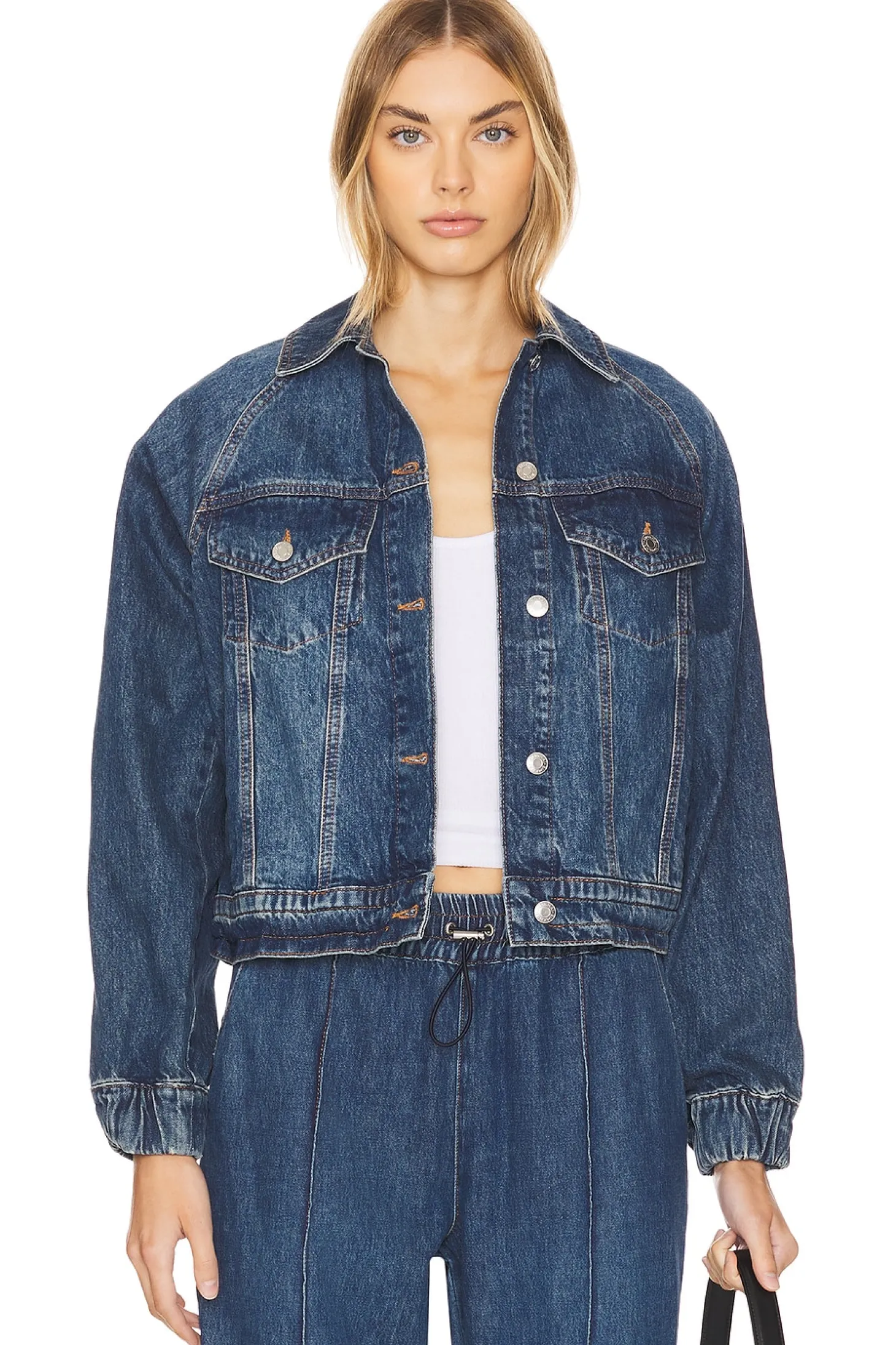 Self 1: 100% cotton Self 2: 100% polyester.Made in Turkey.Machine wash.Front button closure.4-pocket styling.Zippered detail at sleeves.Structured denim fabric with cinched cuffs and cinched drawcord hem.Item not sold as a set
