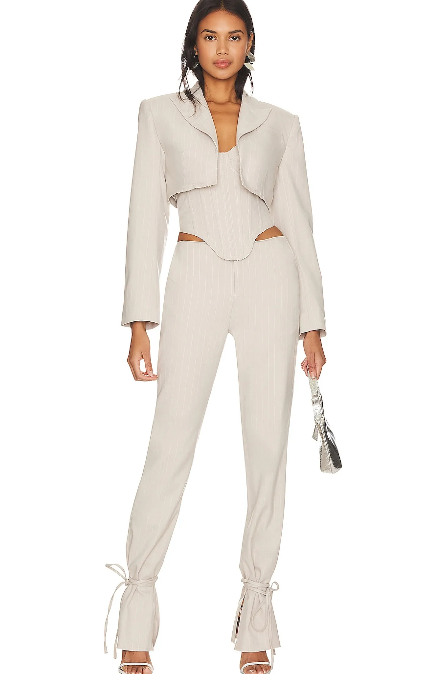 Self: 64% polyester 34% viscose 2% elastane Lining: 55% polyester 45% rayon Contrast Fabric: 100% cotton.Made in China.Dry clean only.Exposed back zipper closure.Unpadded underwire bust.Boned bodice.Suiting fabric with kerchief hem.Item not sold as set