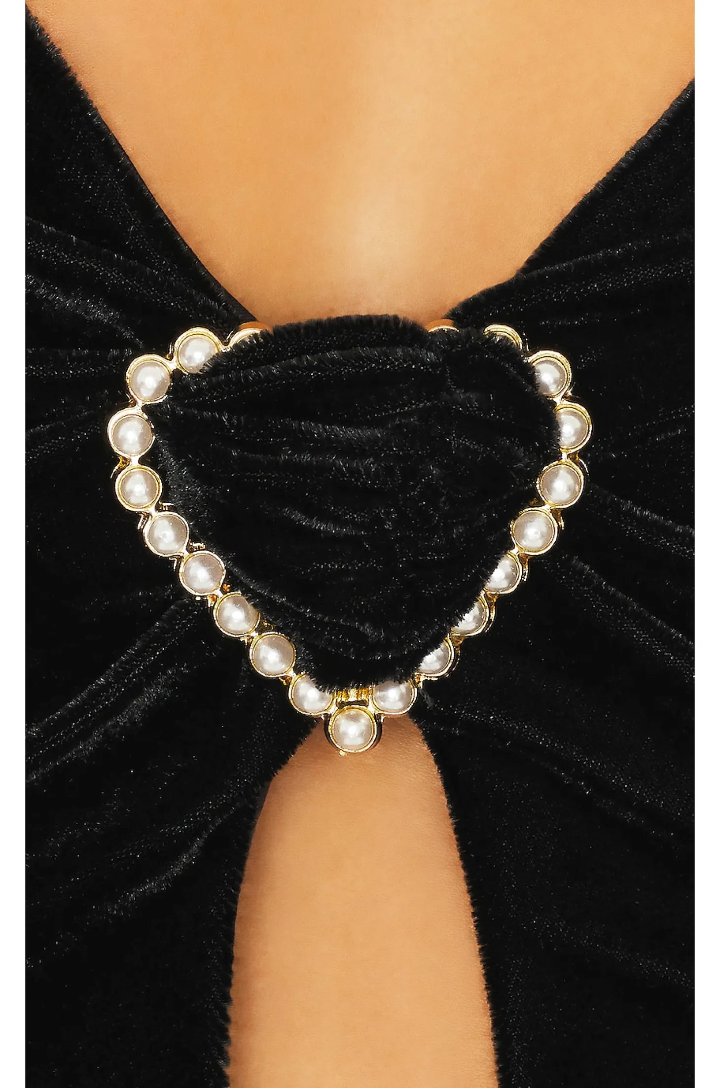 93% polyester 7% elastane.Made in China.Dry clean only.Unlined.Hidden back zipper closure.Heart shaped pearl accent at bust with cut-out design.Faux pearl shoulder straps and trim Velvet fabric
