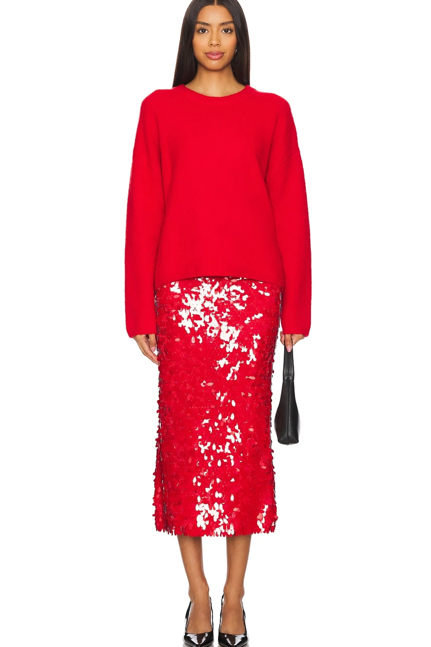 Sefl: 100% polyester Lining: 95% polyester 5% elastane.Made in China.Dry clean recommended.Fully lined.Pull-on styling with elastic waistband.Sequin embellished mesh fabric.Skirt measures approx 32" in length