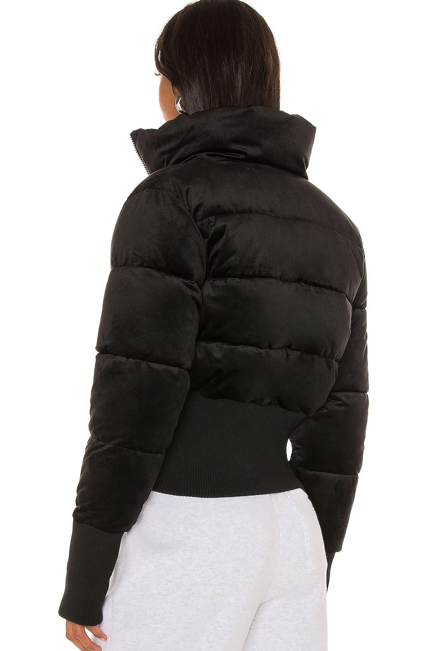 Self, Lining & Fill: 100% poly Trim: 80% poly 20% elastane.Hand wash cold.Front zipper closure.Ribbed cuffs and hem.Thumbholes.Velvet fabric with quilted stitching.Imported