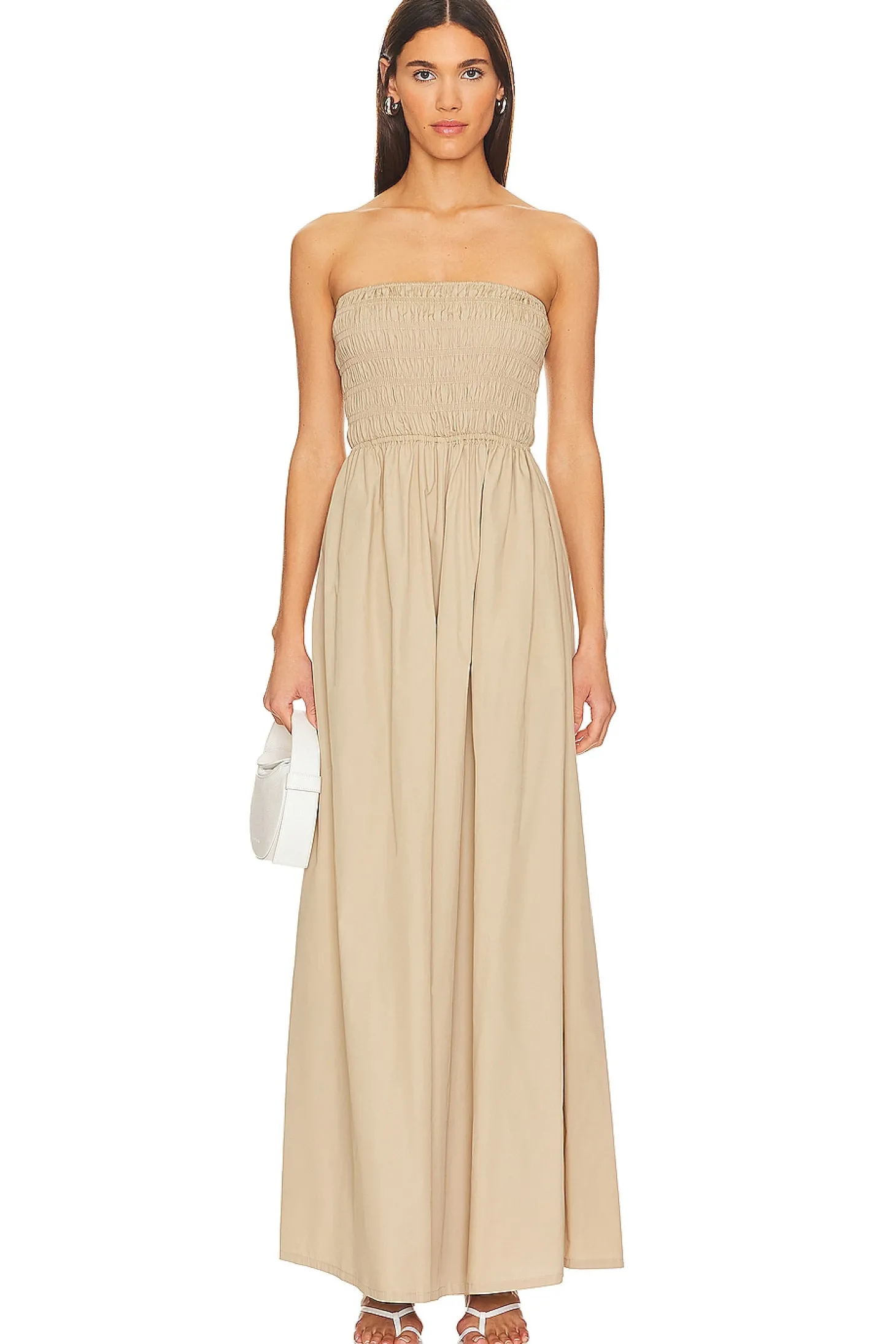 100% cotton.Made in USA.Dry clean only.Pull-on styling.Smocked elastic bodice.Side seam pockets.Poplin fabric