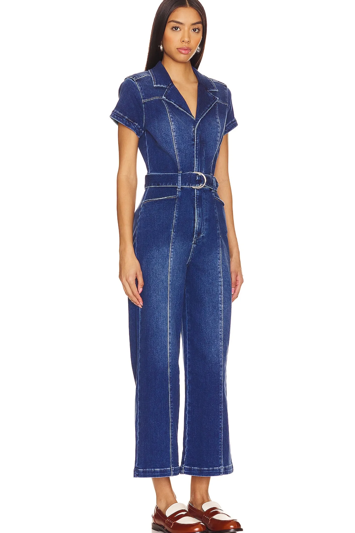 93% cotton 5% polyester 2% spandex.Made in China.Dry clean only.Front zipper closure.Detachable waist belt with D-ring closure.Front and back slip pockets.Subtle stretch denim fabric