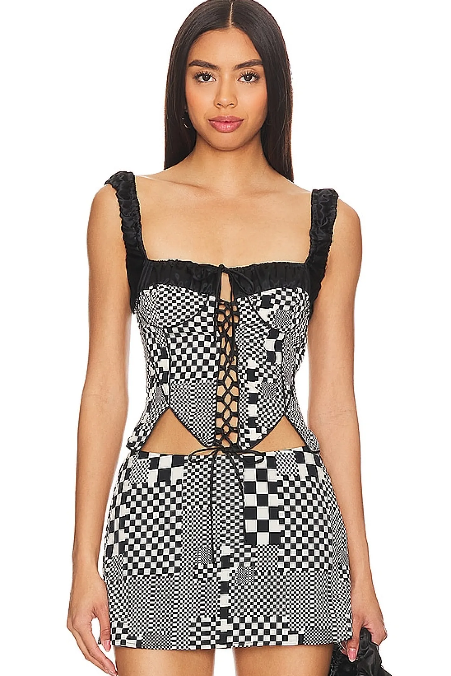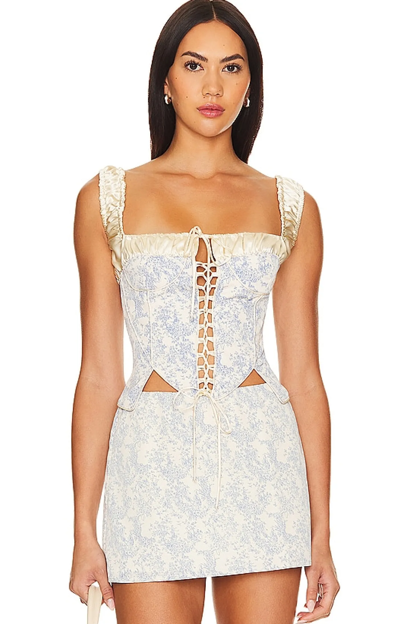 Self & Lining: 100% polyester Trim: 100% silk.Made in U.S.A.Machine wash.Lace-up front tie closure.Satin shoulder straps and neckline trim.Crepe bodice.Item not sold as a set