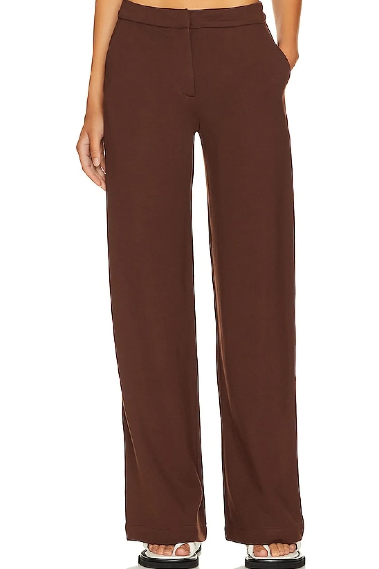 62% rayon 33% nylon 5% spandex.Made in China.Machine wash.Zip fly with hook and bar closure.Side slant pockets.Jersey fabric.22" at the knee and 22" at the leg opening