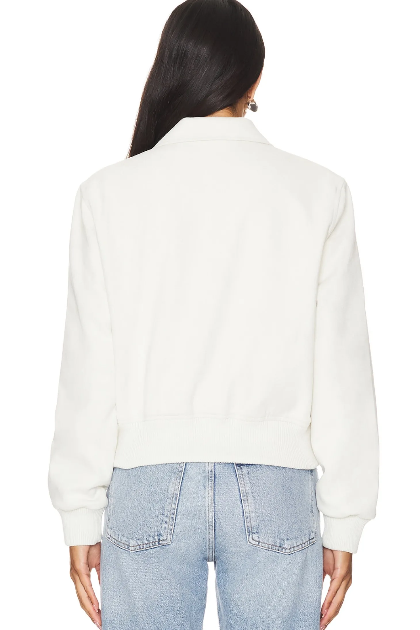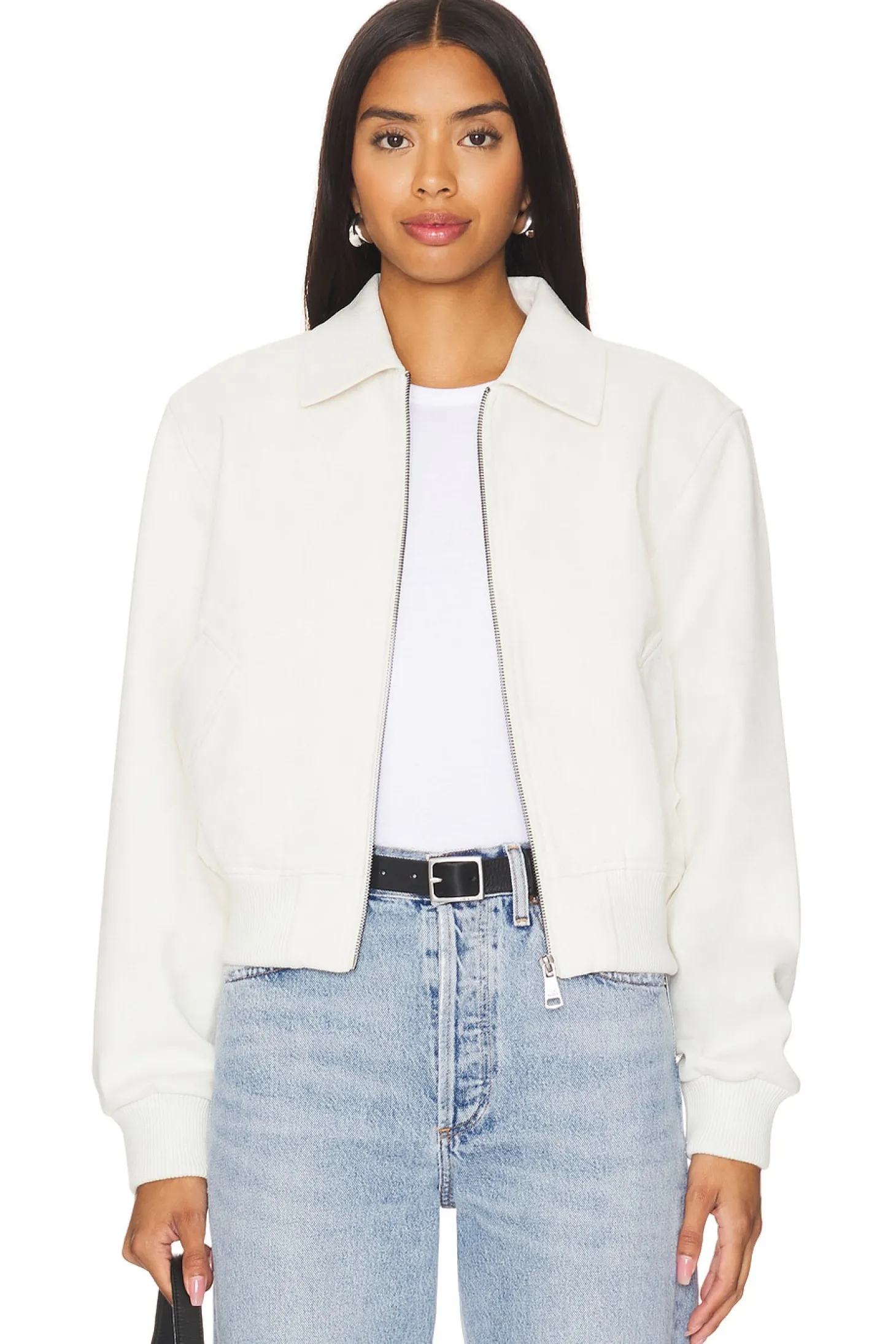 Faux suede textile.Imported.Dry clean recommended.Front zipper closure.Side slant pockets.Ribbed cuffs