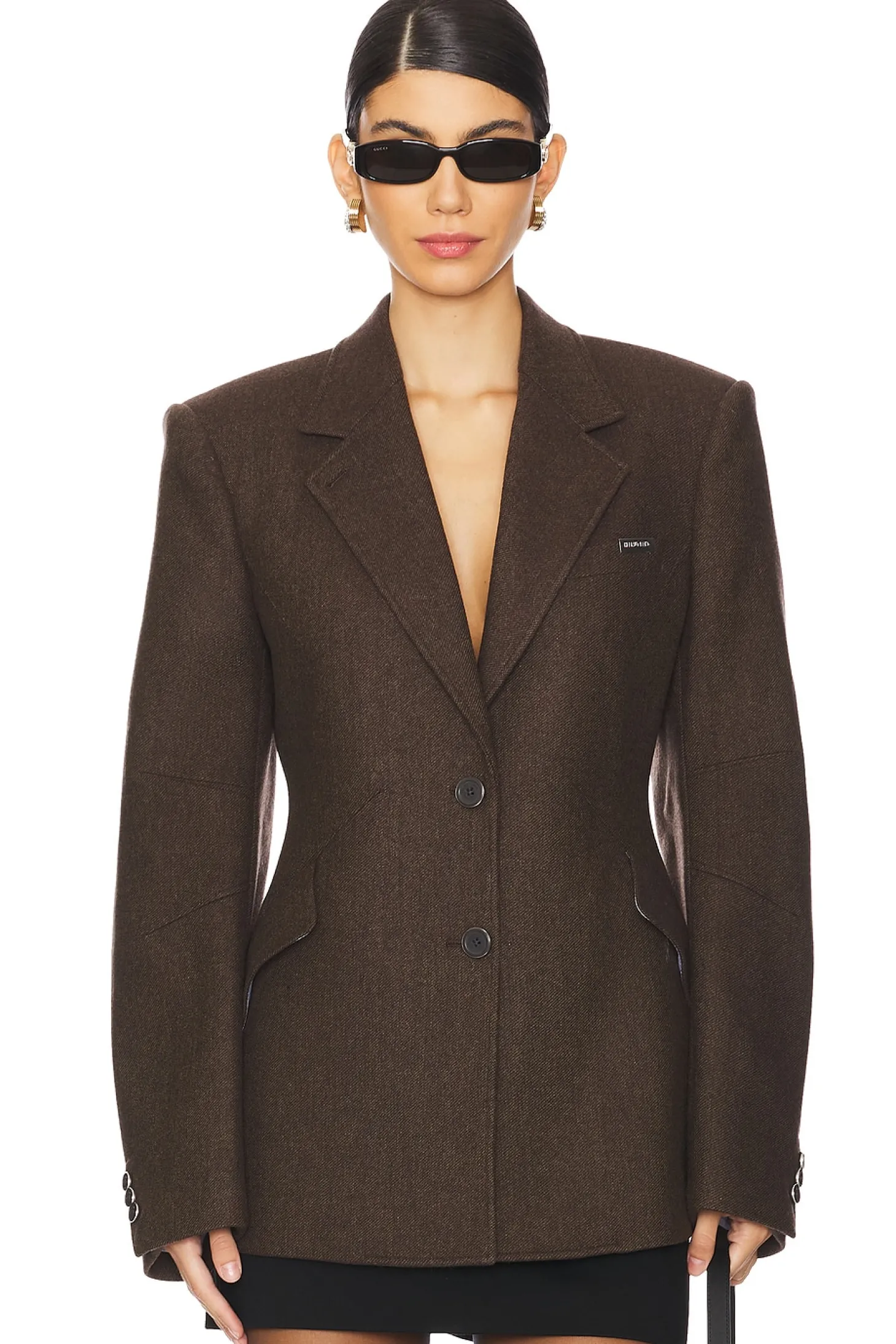 Self 1: 70% wool 30% polyamide Self 2: 50% linen 35% wool 15% viscose.Made in China.Dry clean only.Front button closure.Structured padding at shoulders with buttoned cuffs.Breast welt pocket with silver tone logo embossed hardware.Side flap pockets and darted waist