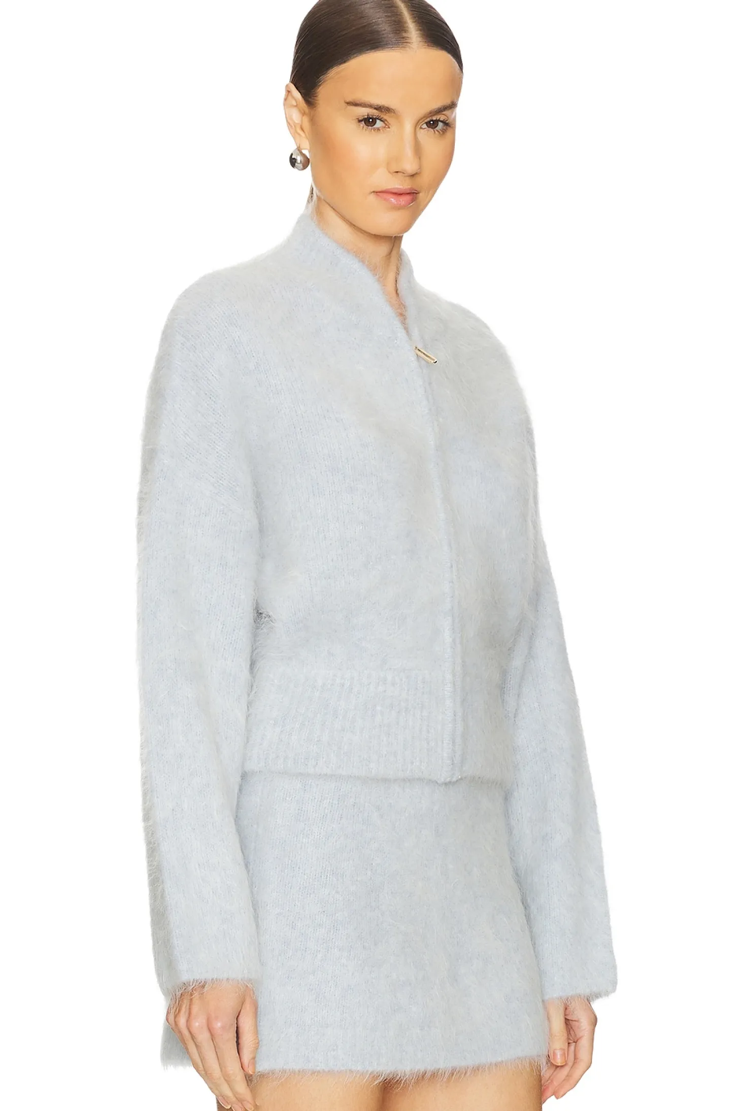 59% alpaca 25% acrylic 15% nylon 1% elastane.Made in China.Dry clean only.Hidden front zipper closure.Fuzzy knit fabric.Item not sold as set