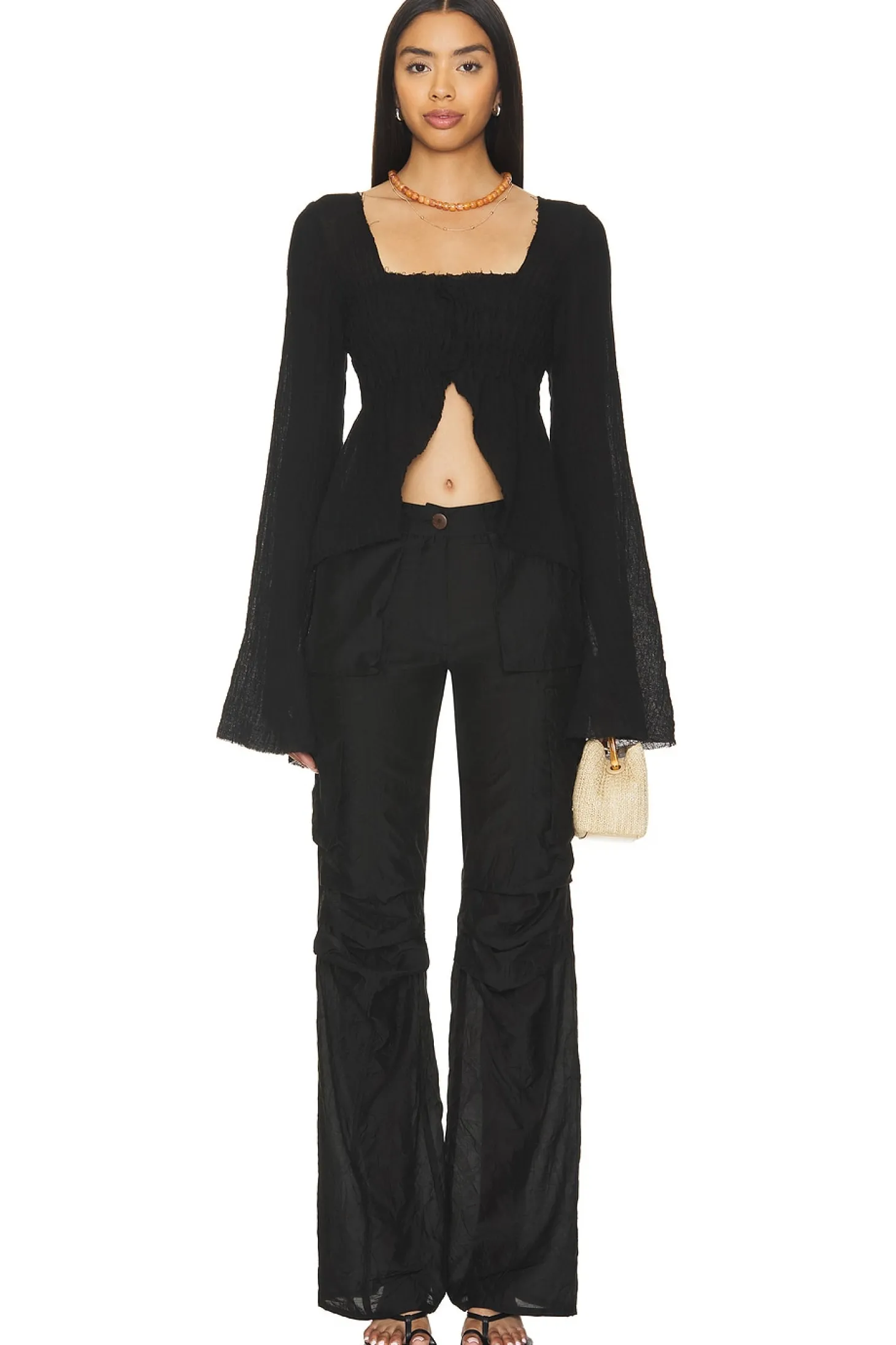 70% cotton 30% silk.Made in Ukraine.Machine wash.Zip fly with button closure.6 pocket styling.18.5" at the knee and breaks to 20" at the leg opening