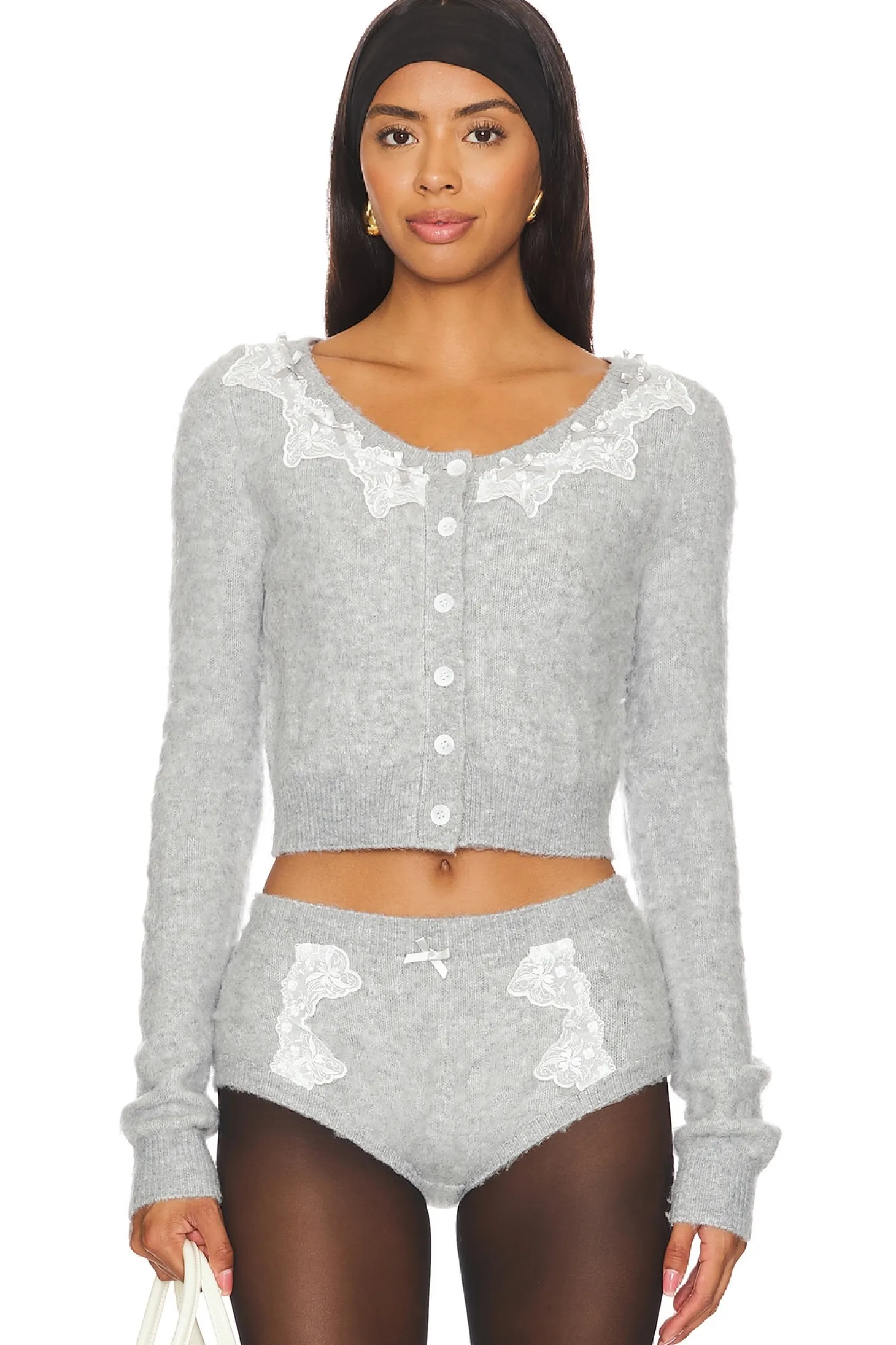 Knit textile.Imported.Hand wash recommended.Front button closure.Lace trim and bow embellishment.Fuzzy midweight knit fabric