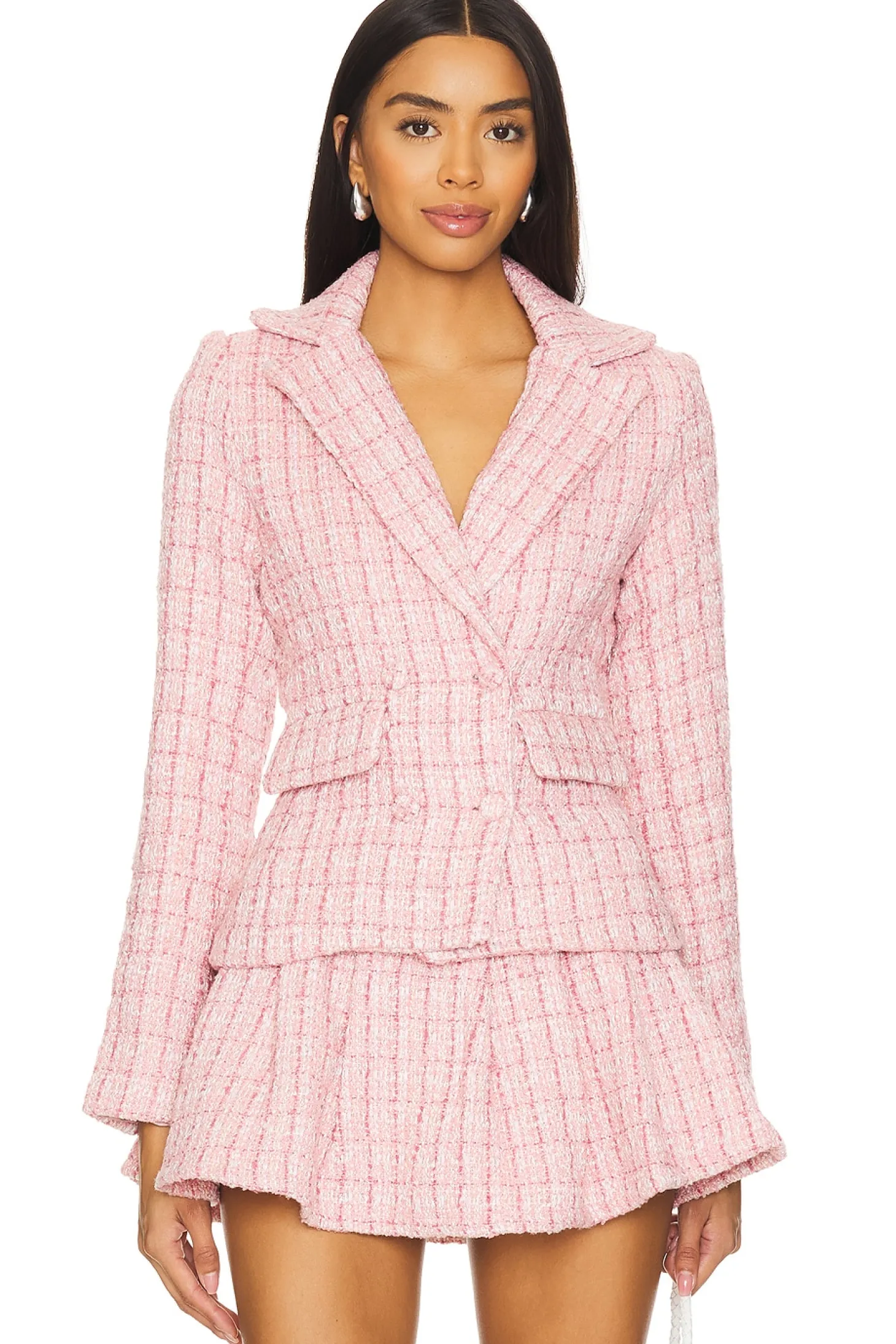 100% polyester.Made in China.Hand wash.Double breasted closure.Front flap pockets.Faux buttoned cuffs.Tweed fabric with padded shoulders.Item not sold as set