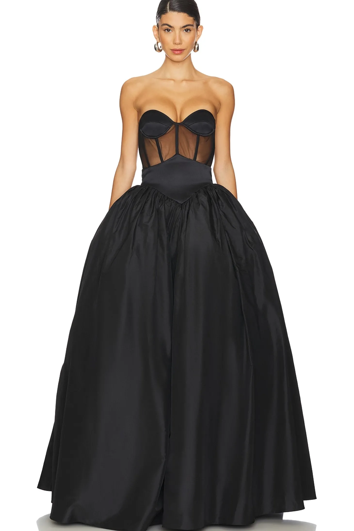 100% polyester.Made in Turkey.Dry clean only.Partially lined.Hidden back zipper closure.Boned bodice with padded underwire cups.Mesh corset bodice with structured tulle skirt.Neckline to hem measures approx 55" in length