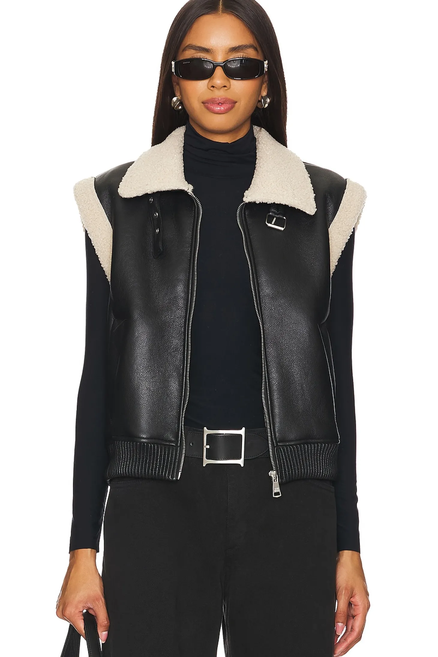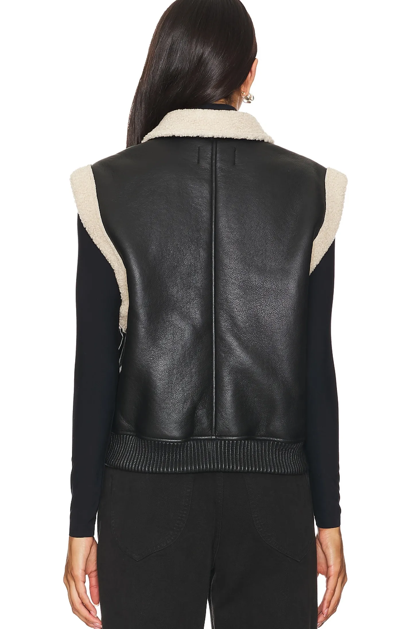 Self: 100% polyurethane Backing & Lining: 100% polyester.Made in China.Wipe clean only.Front zipper closure.Side slant pockets.Ribbed hem.Midweight faux leather fabric with faux fur lining