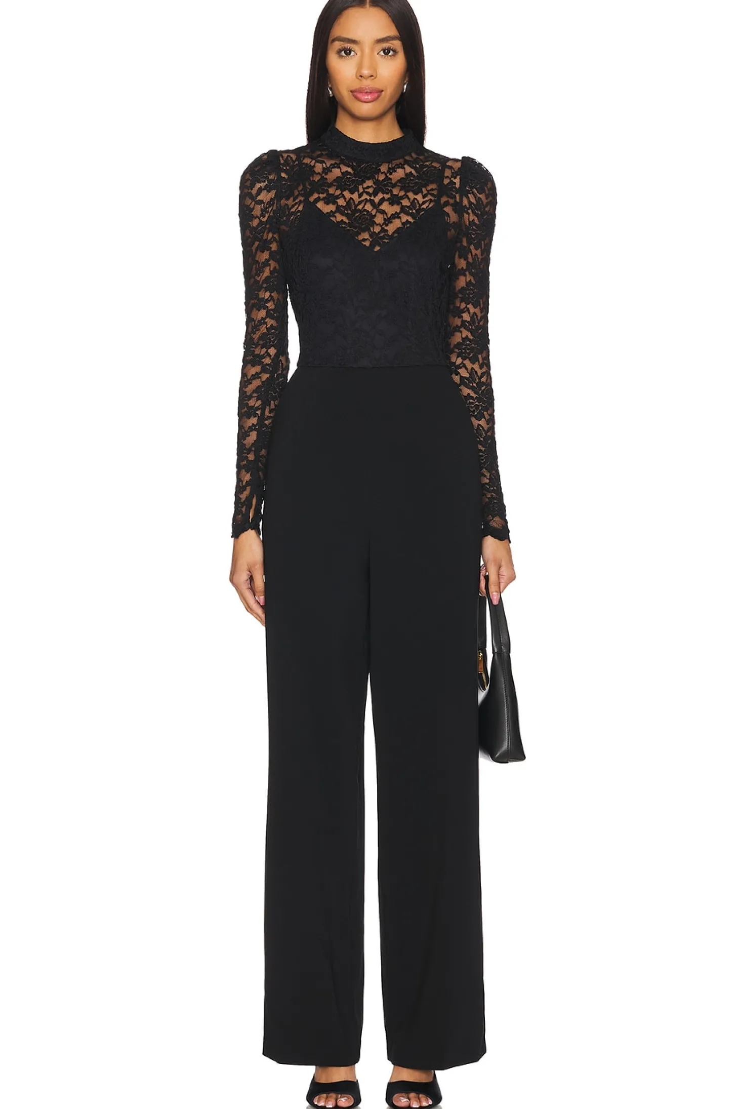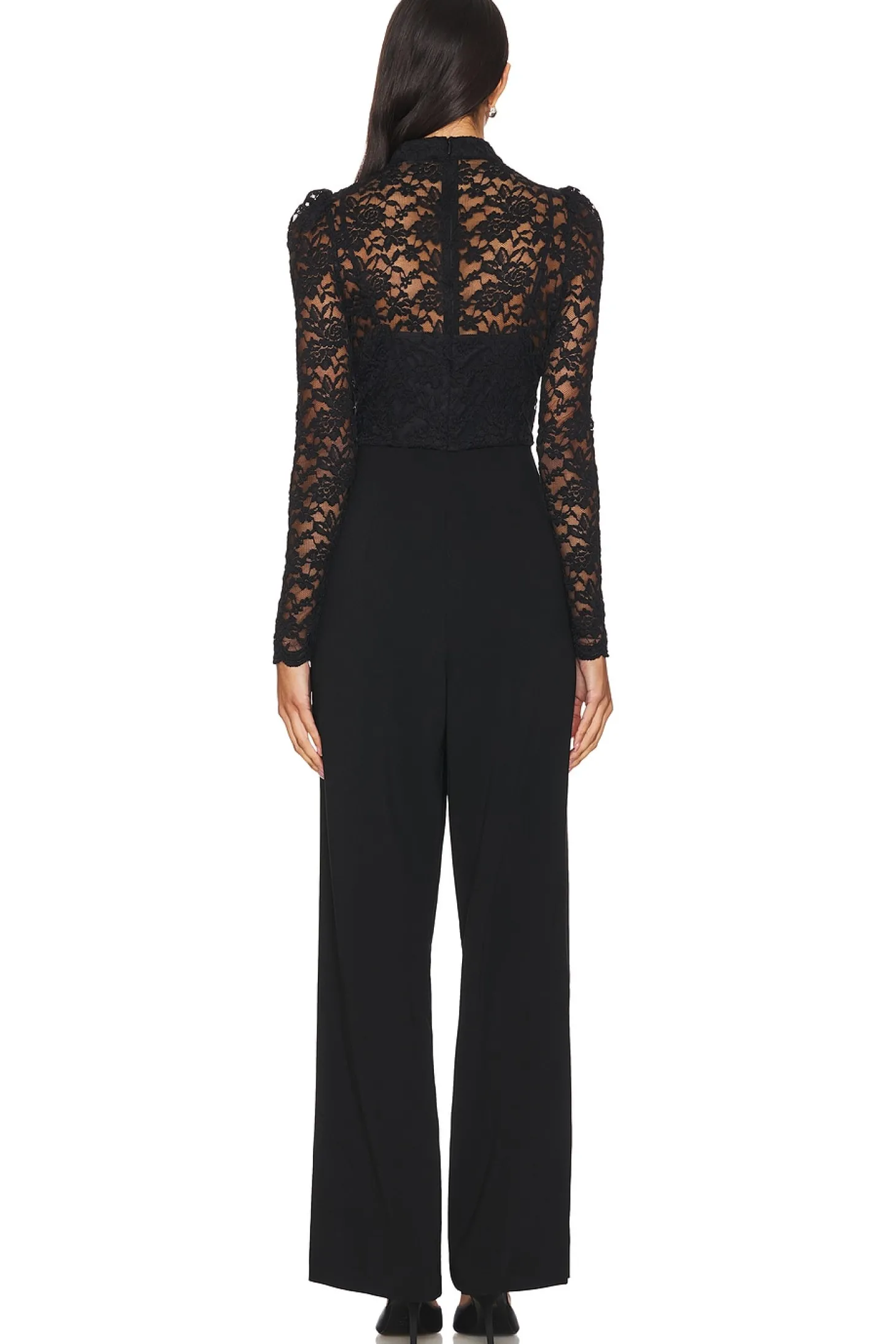 80% nylon 20% terylene.Made in Vietnam.Dry clean only.Hidden back zipper closure.Side pockets.Buttoned cuffs.Lace bodice and crepe pants