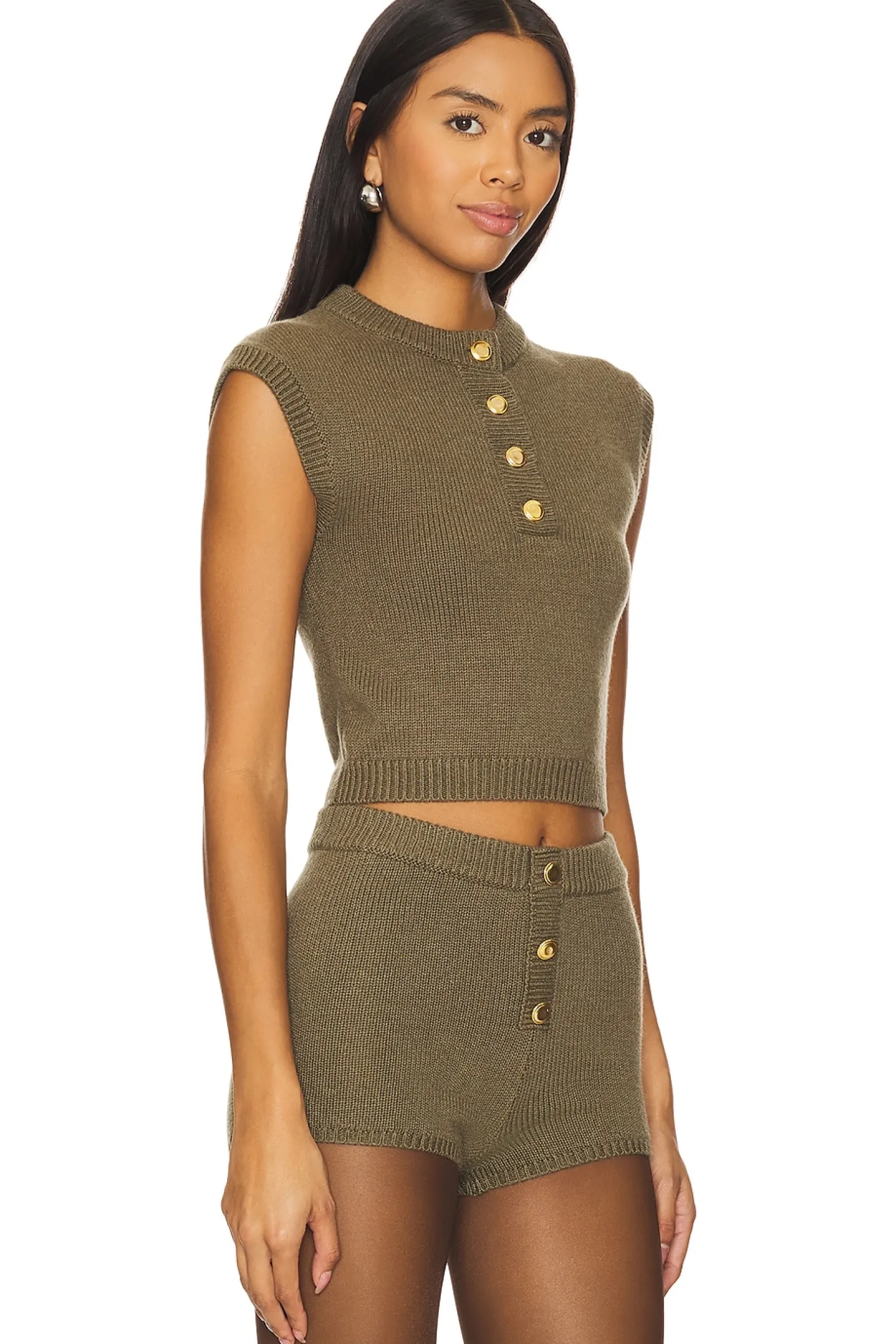 60% cotton 30% nylon 10% wool.Made in China.Hand wash.Pull-on styling with partial front button closure.Cropped fit design.Midweight knit fabric.Item not sold as a set