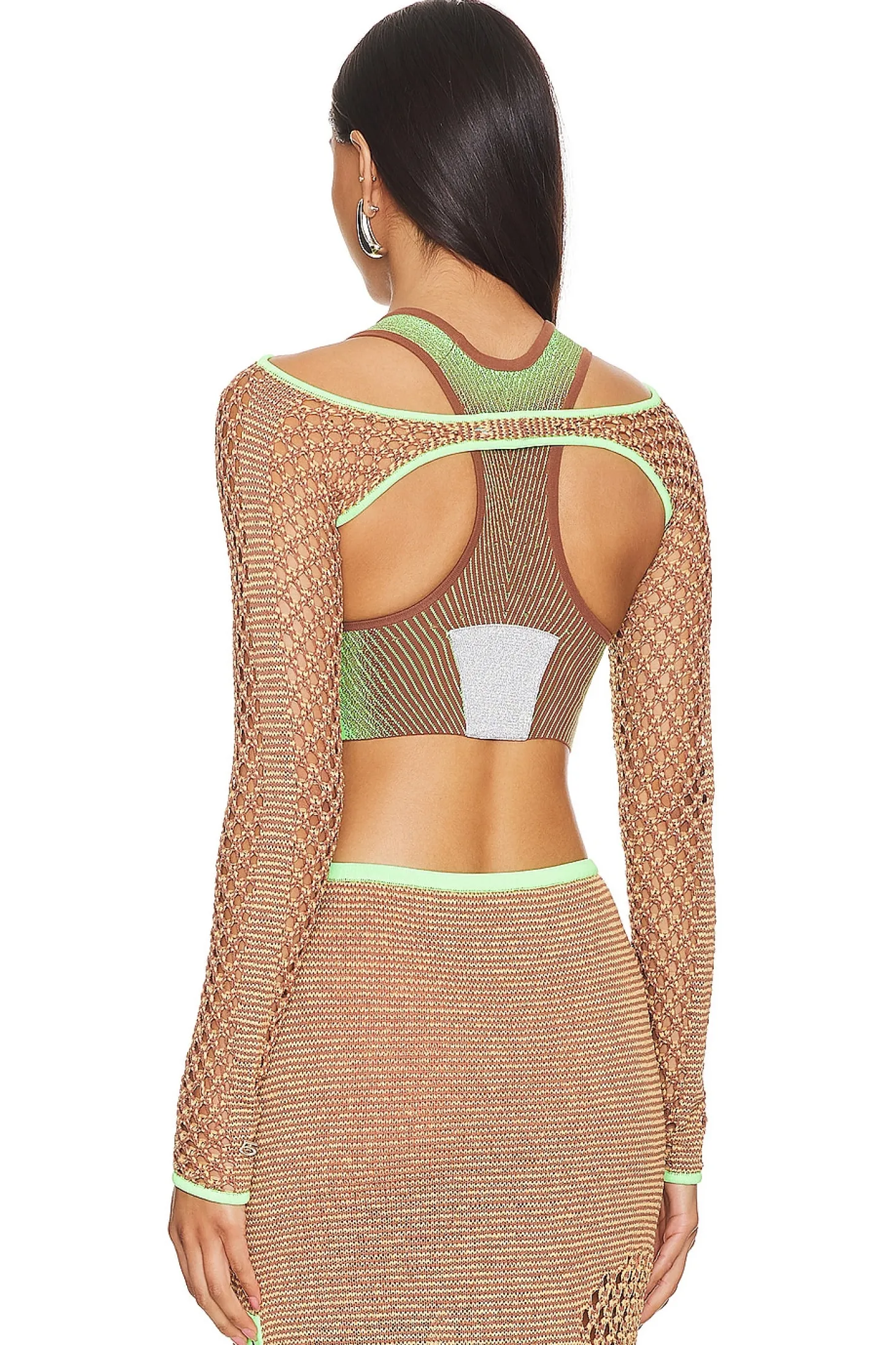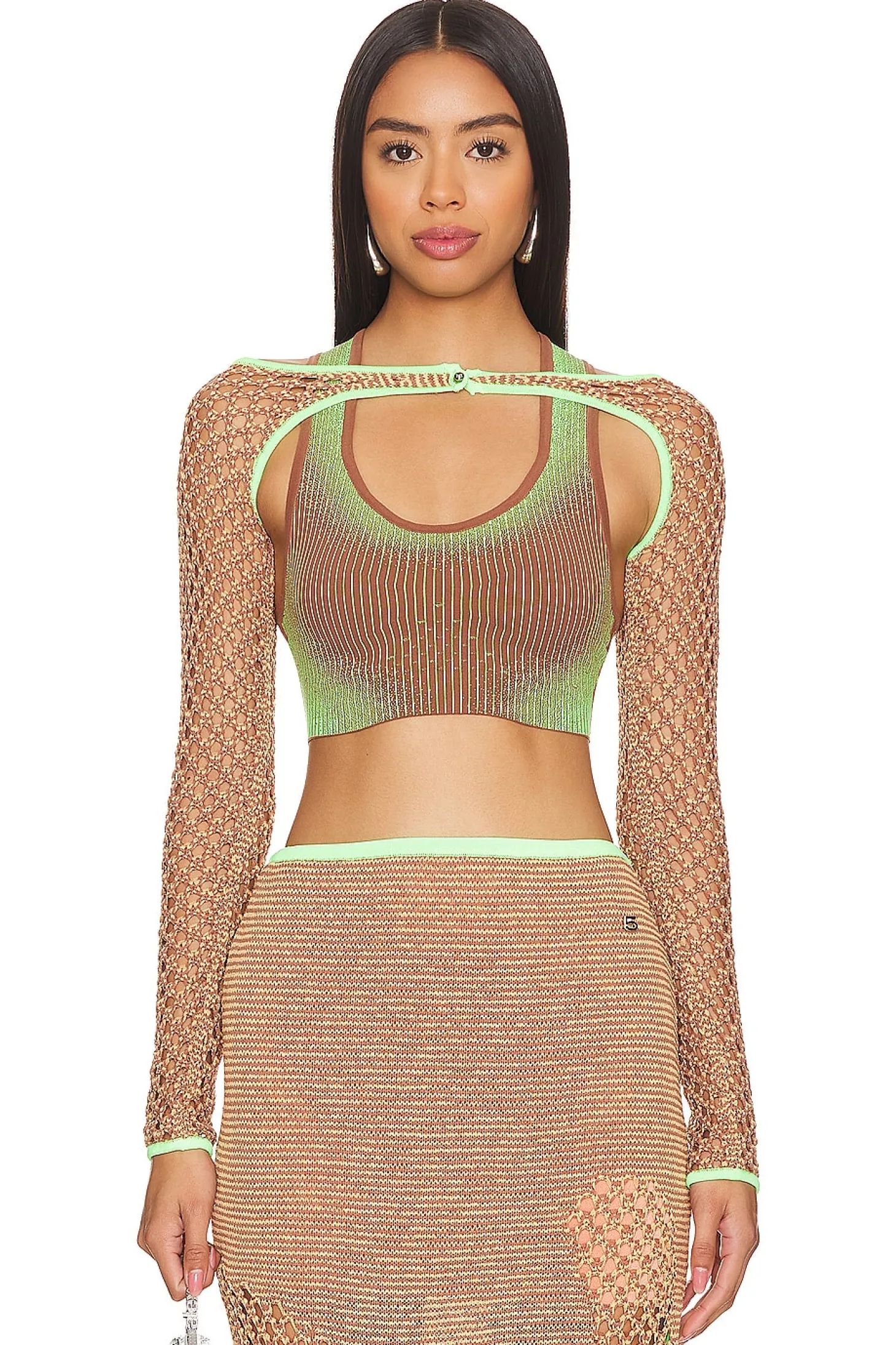 Self: 100% recycled nylon Contrast Fabric: 83% recycled viscose 17% nylon.Made in China.Hand wash.Front button loop closure.Open crochet knit fabric.Shrug styling.Item not sold as a set