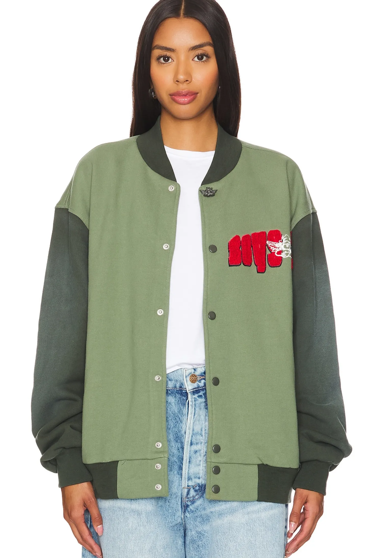 Self: 87% cotton 13% polyester Lining: 100% nylon.Made in China.Machine wash.Front snap button closure.Side pockets.Jersey fabric with embroidered detail