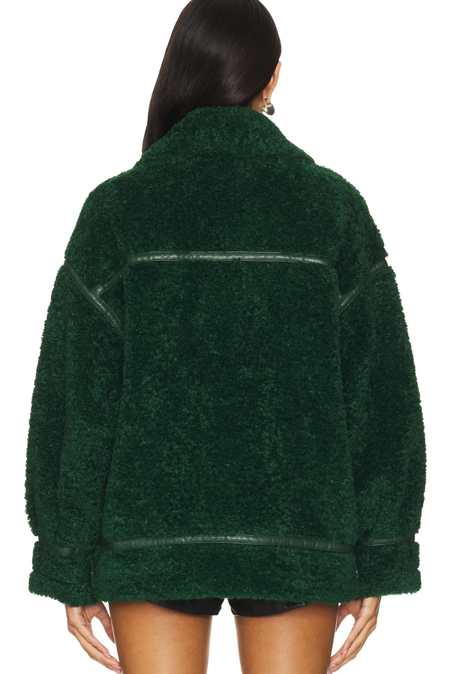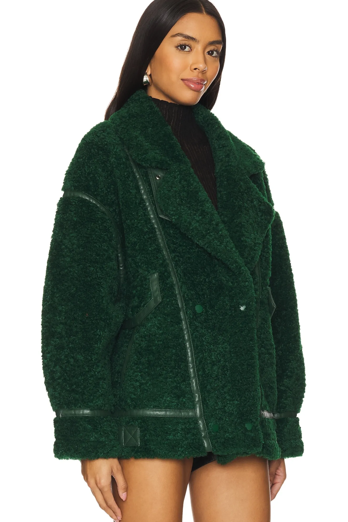 Self: 100% polyester Trim: 100% polyurethane.Made in China.Dry clean only.Front snap closure.Front slant welt pockets Notched lapel collar.Heavyweight faux fur fabric