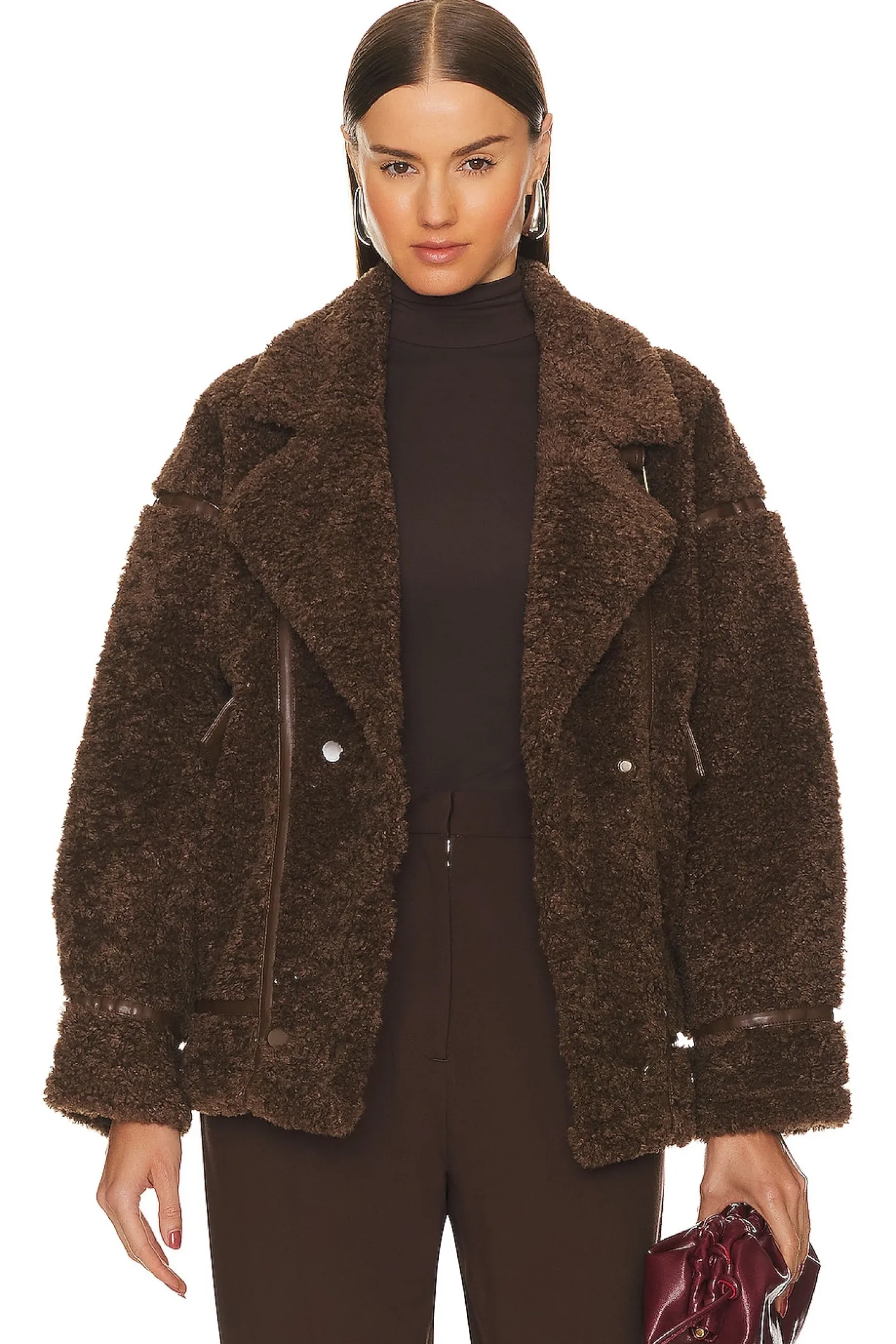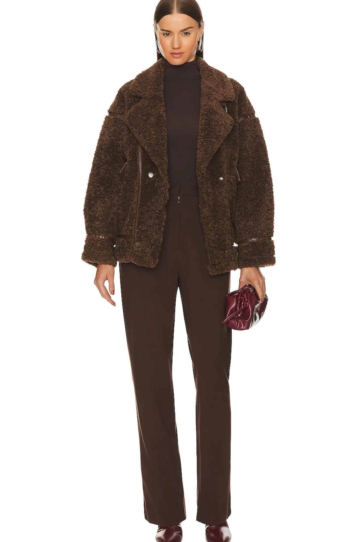 Faux Fur: 100% polyester Trim: 100% polyurethane Backing: 100% polyester.Made in China.Dry clean only.Front button closure.Belted detail at neckline.Front faux flap pockets.Side slant pockets.Faux fur fabric with faux leather trim