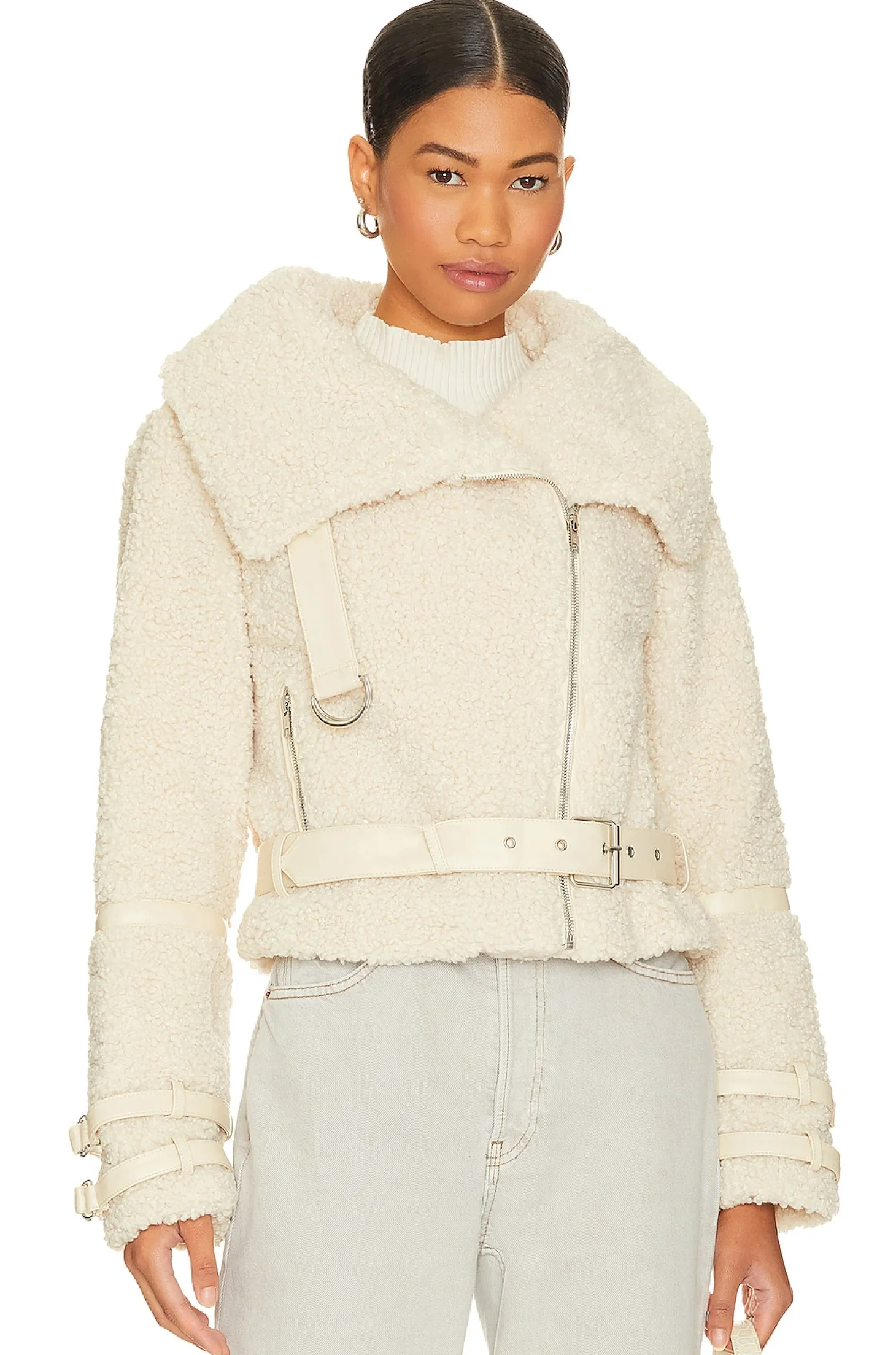 Self, Lining, & Belt Back: 100% polyester Belt Face: 100% polyurethane.Made in China.Dry clean only.Front zipper closure.Foldover top styling.Tonal faux leather waist belt and belt accents at top and cuffs.Spiral faux fur fabric