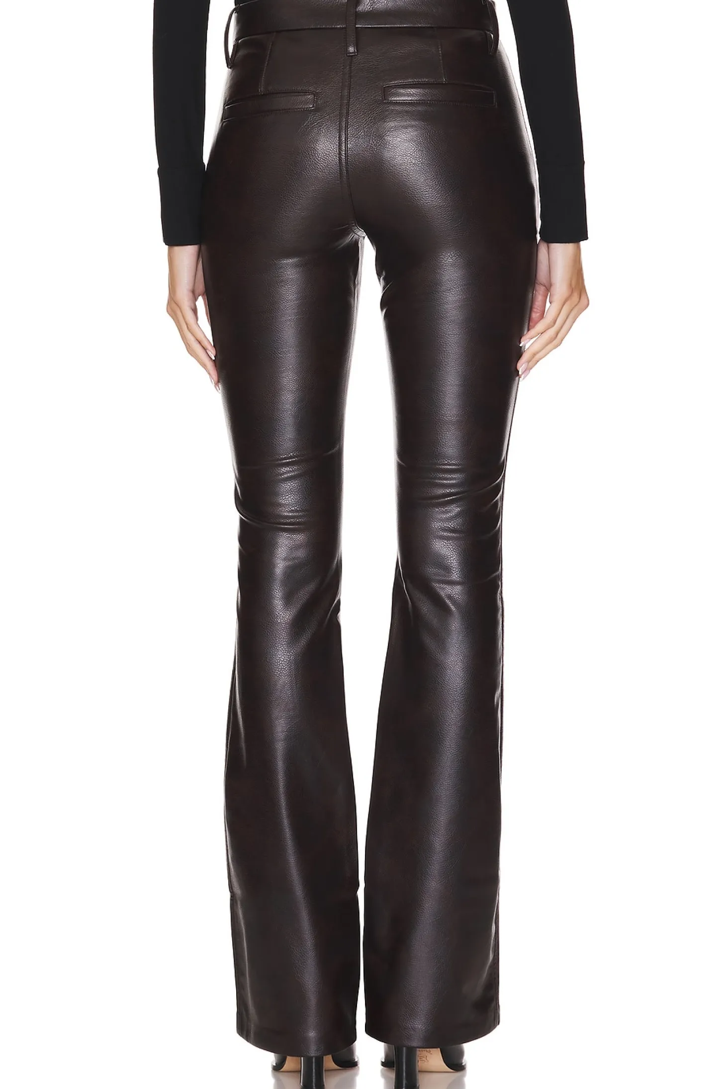 Self 1: 100% polyurethane Self 2: 100% polyester Lining: 70% polyester 30% cotton.Made in China.Professional leather clean only.Zip fly with button closure.4 pocket styling.7" at the knee and breaks to 9" at the leg opening
