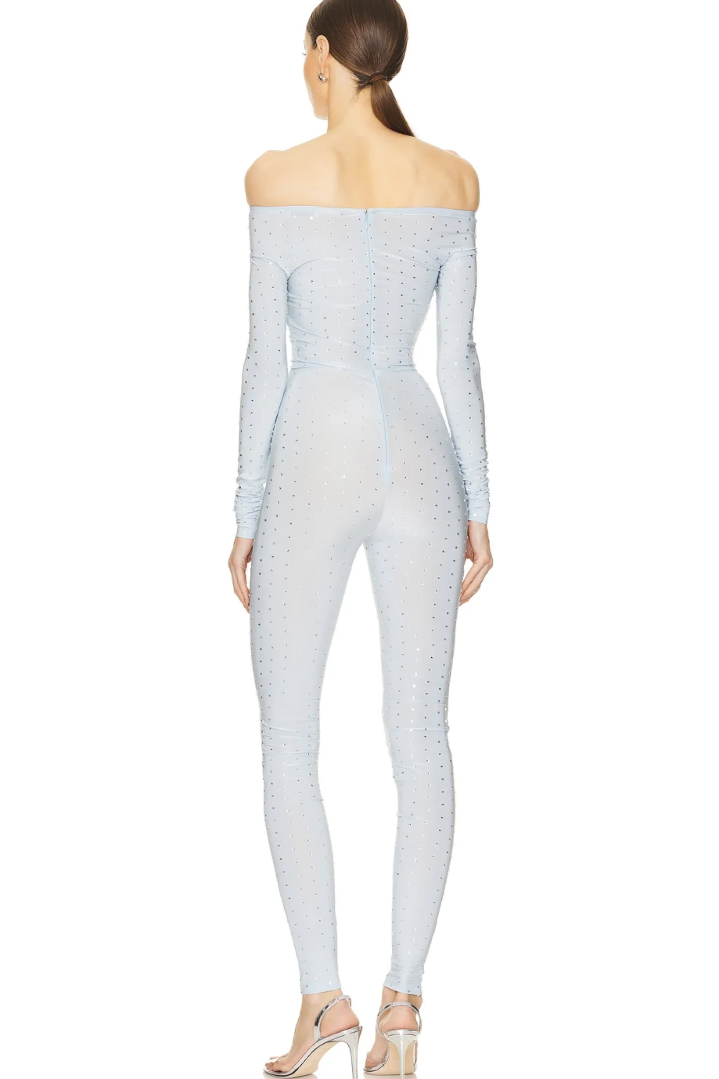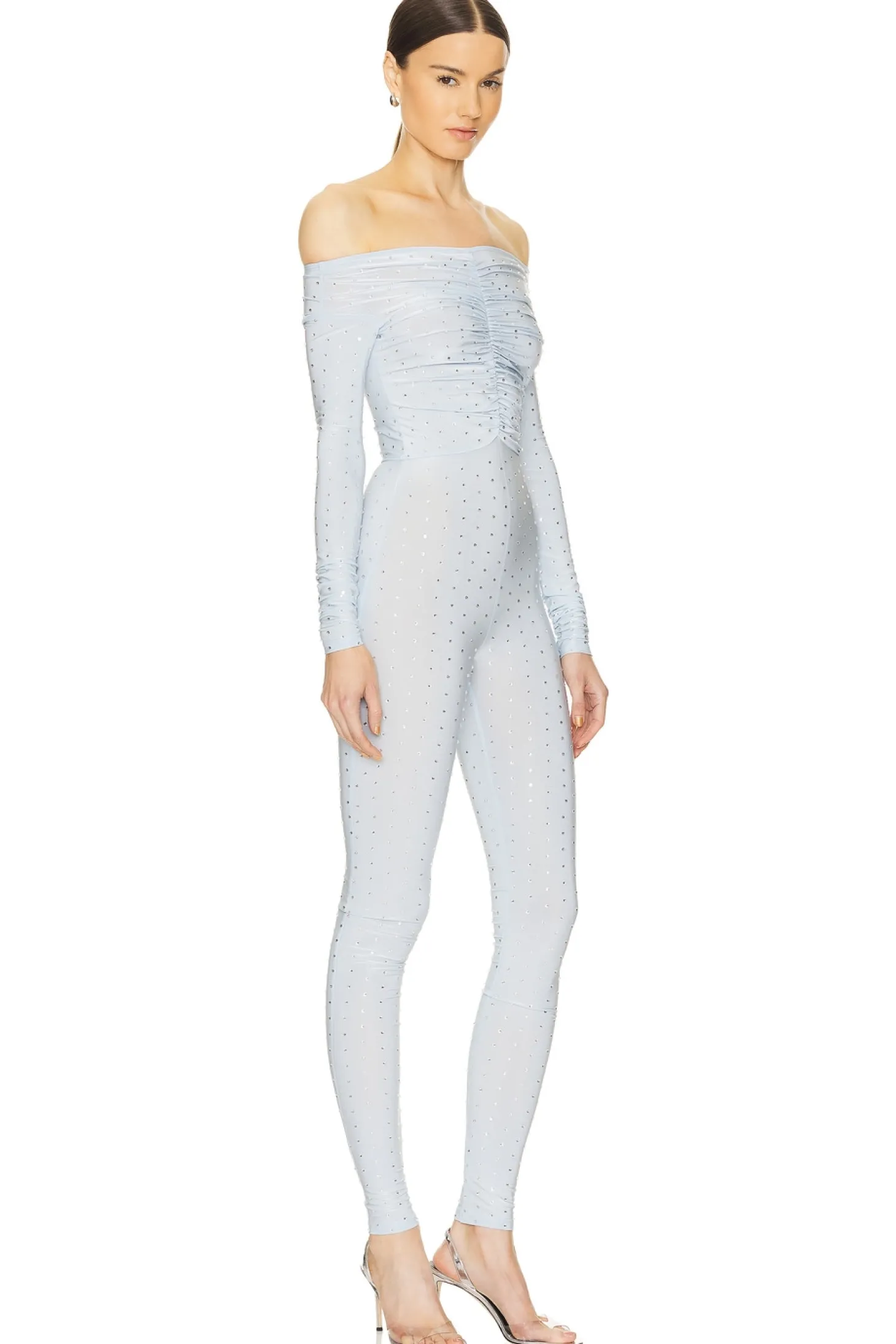 Jersey blend.Imported.Dry clean recommended.Hidden back zipper closure.Off the shoulder styling.Ruched fabric with crystal embellishments throughout.Neckline to hem measures approx 55.5" in length 12" at the knee narrows to 8" at the leg opening