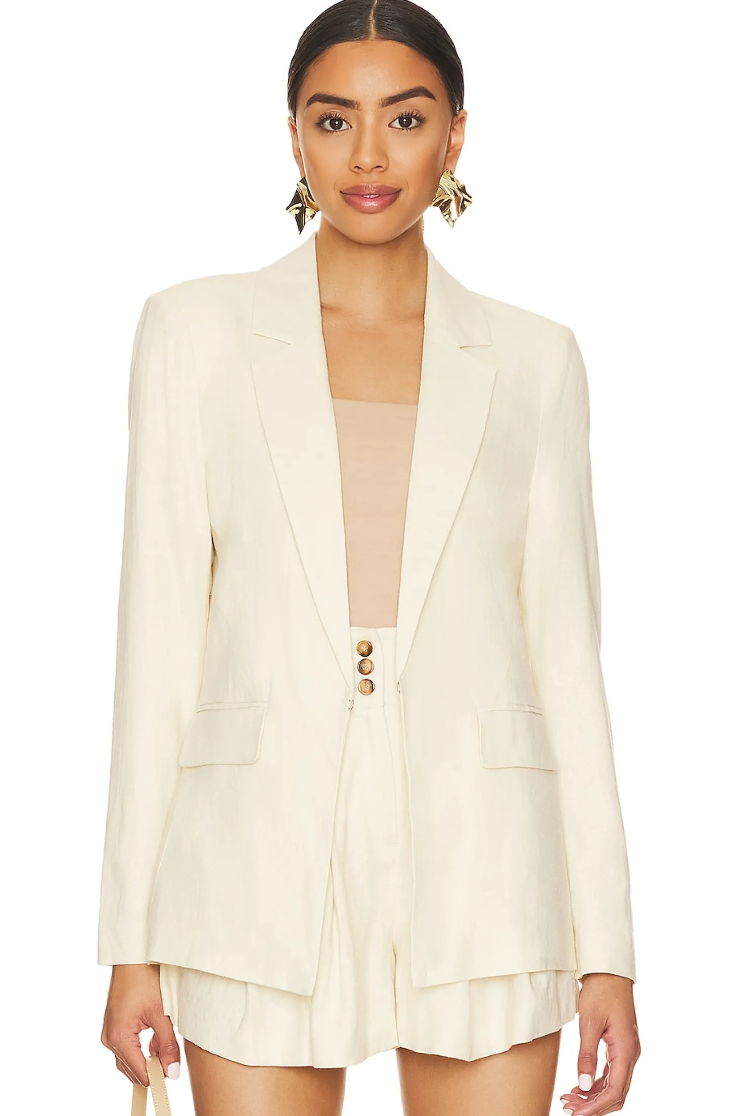 Linen blend.Imported.Dry clean recommended.Front hook and eye closure.Front flap pockets.Lightly padded shoulders.Split cuffs.Lightweight linen fabric Item not sold as set