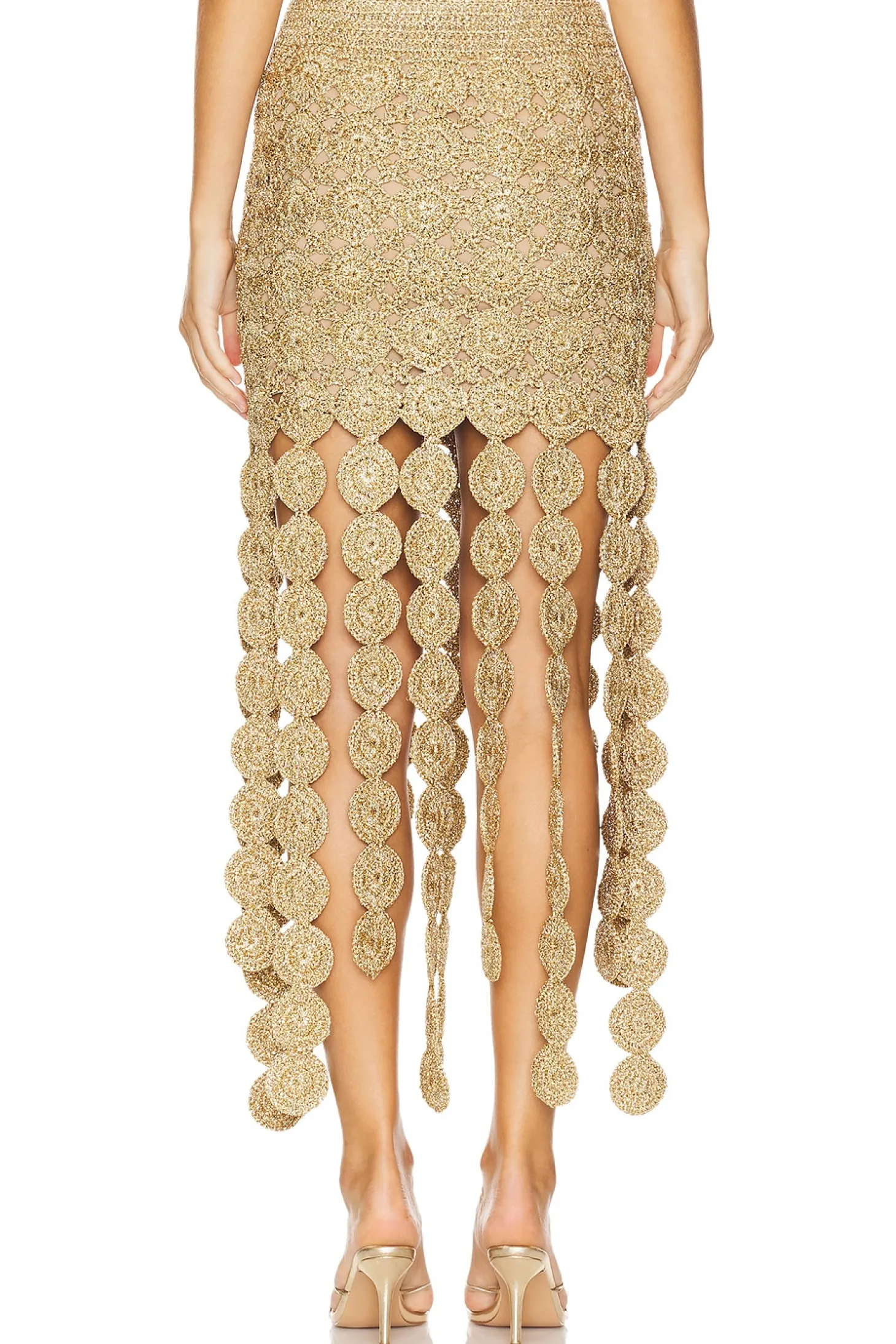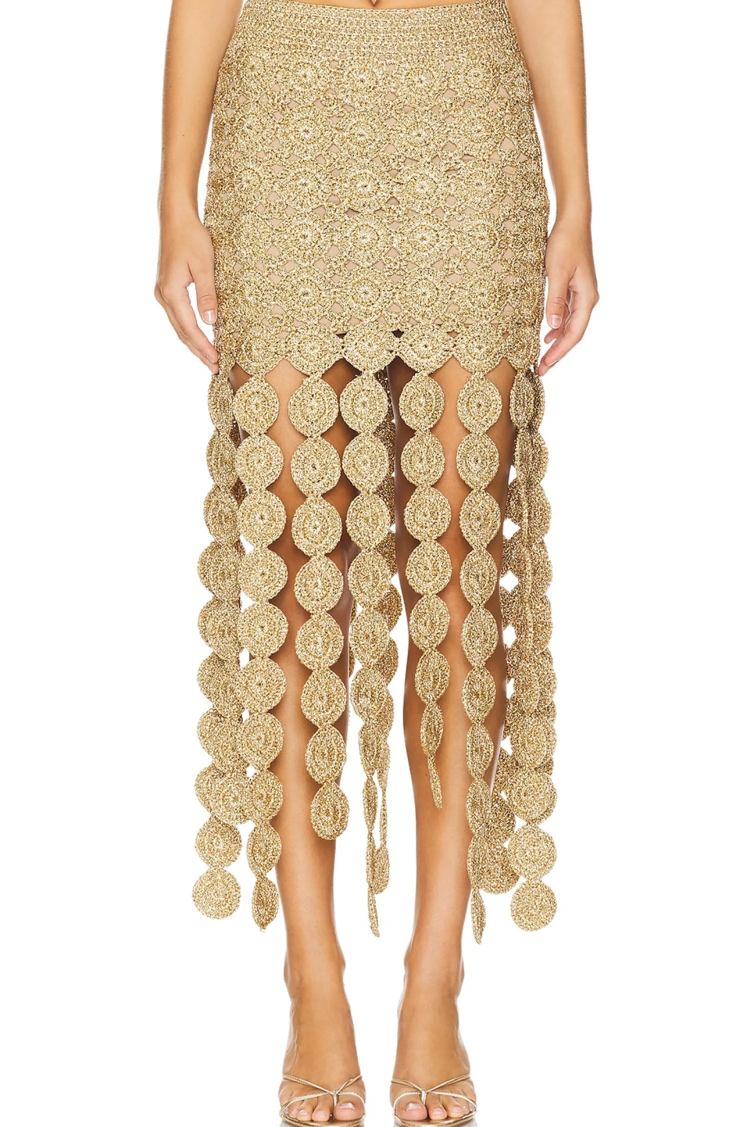 Self & Lining: 100% polyester.Made in China.Hand wash.Partially lined.Pull-on styling with elastic waistband.Raffia fabric with circle fringe design.Item not sold as a set.Waist to shortest hem measures approx 15.5" and to longest hem approx 34" in length