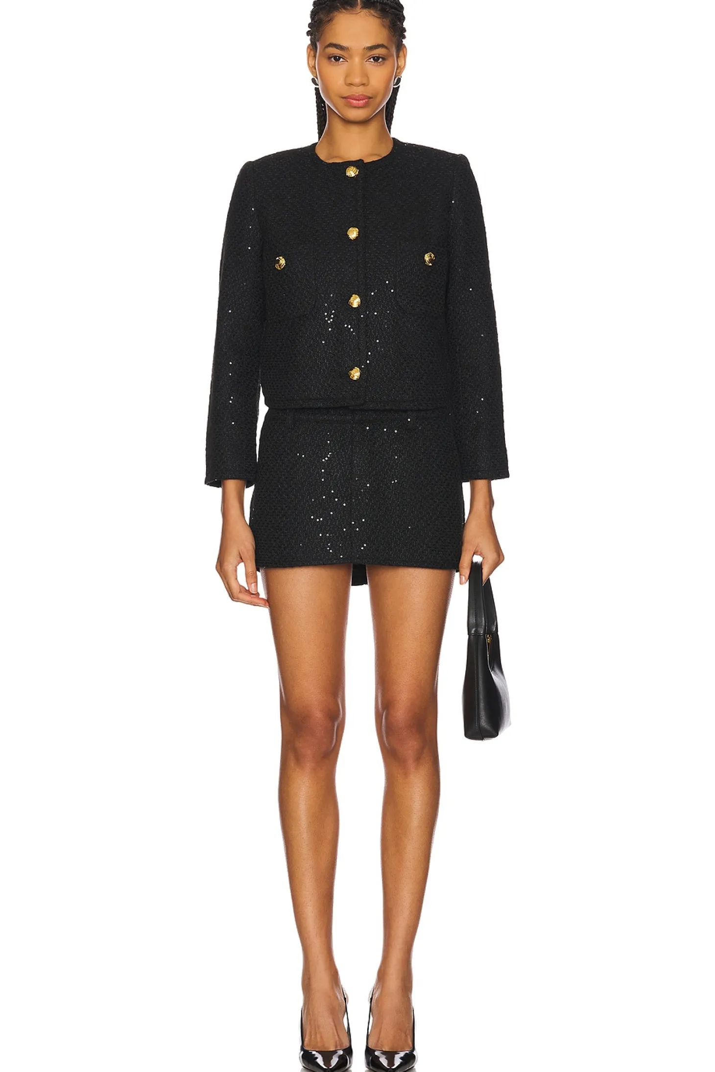 Self: 100% polyester Lining: 95% polyester 5% spandex.Made in China.Hand wash.Front button closure.Front pockets.Buttoned cuffs.Midweight tweed fabric with padded shoulders.Item not sold as set