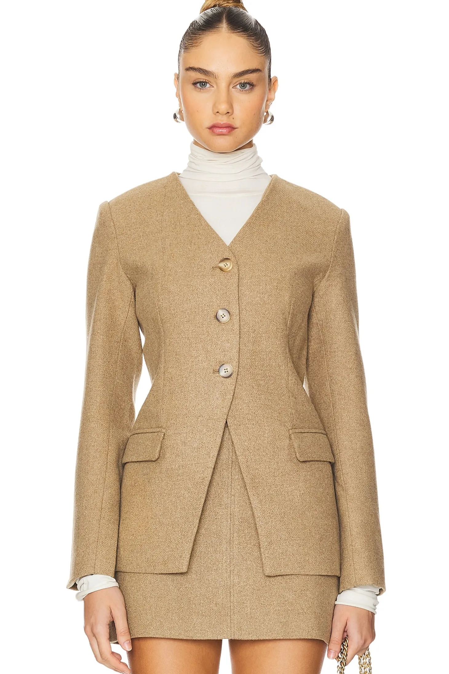 Self: 50% wool 50% polyester<Lining: 100% polyester.Made in China.Dry clean.Front button closure.Faux pocket detail Padded shoulders.Heavyweight wool fabric.Item not sold as a set