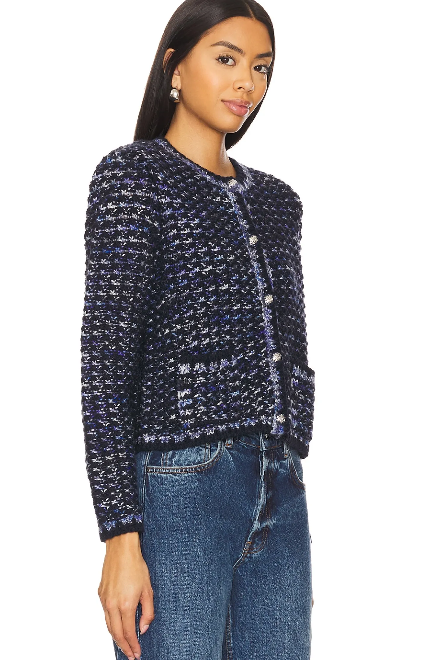 60% wool 14% polyamide 13% polyester 11% acrylic 2% elastane.Made in Italy.Dry clean only.Front silver-tone button closure.Front slip pockets and padded shoulders.Ribbed neckline, cuffs, and hem Midweight knit fabric