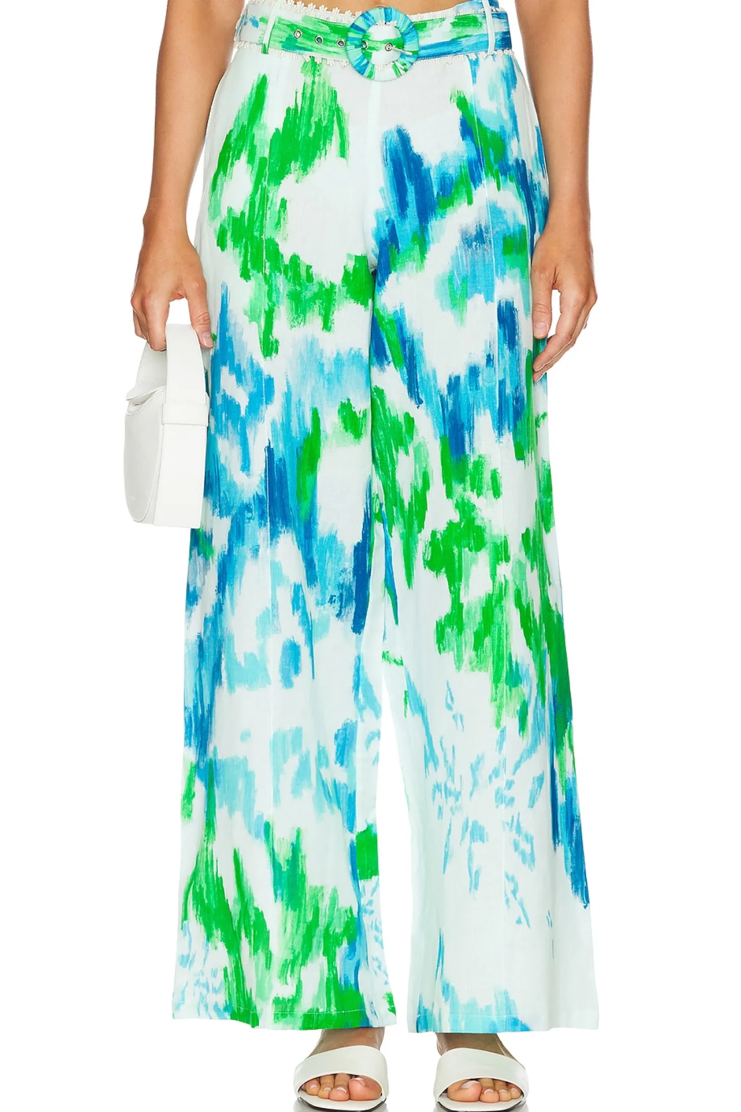 55% linen 45% cotton.Made in India.dry clean.Hidden side zipper closure with detachable belt.4 pocket styling.25" at the knee breaks to 28.5" at the leg opening