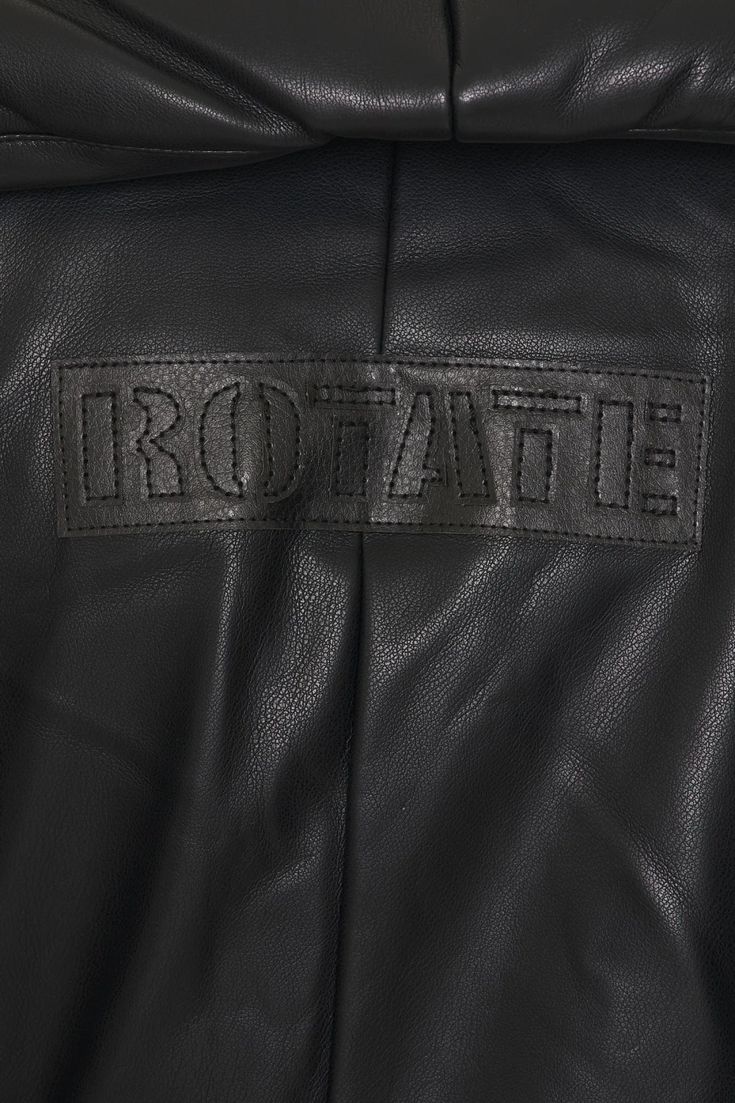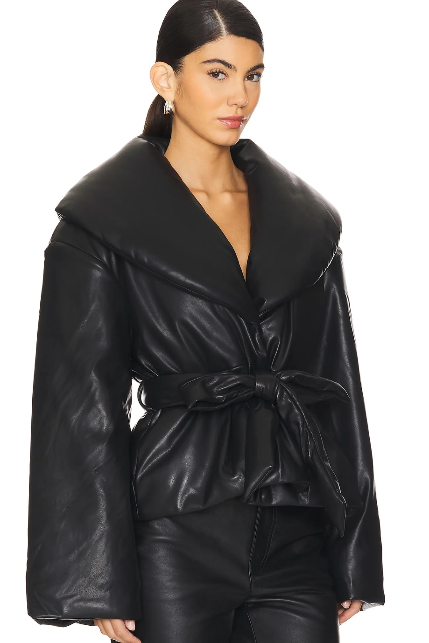 Self: 100% polyester Lining: 92% polyester 8% elastane.Made in China.Machine wash.Front snap button closure with optional waist tie.Side seam pockets.Detachable shoulder pads.Padded faux leather