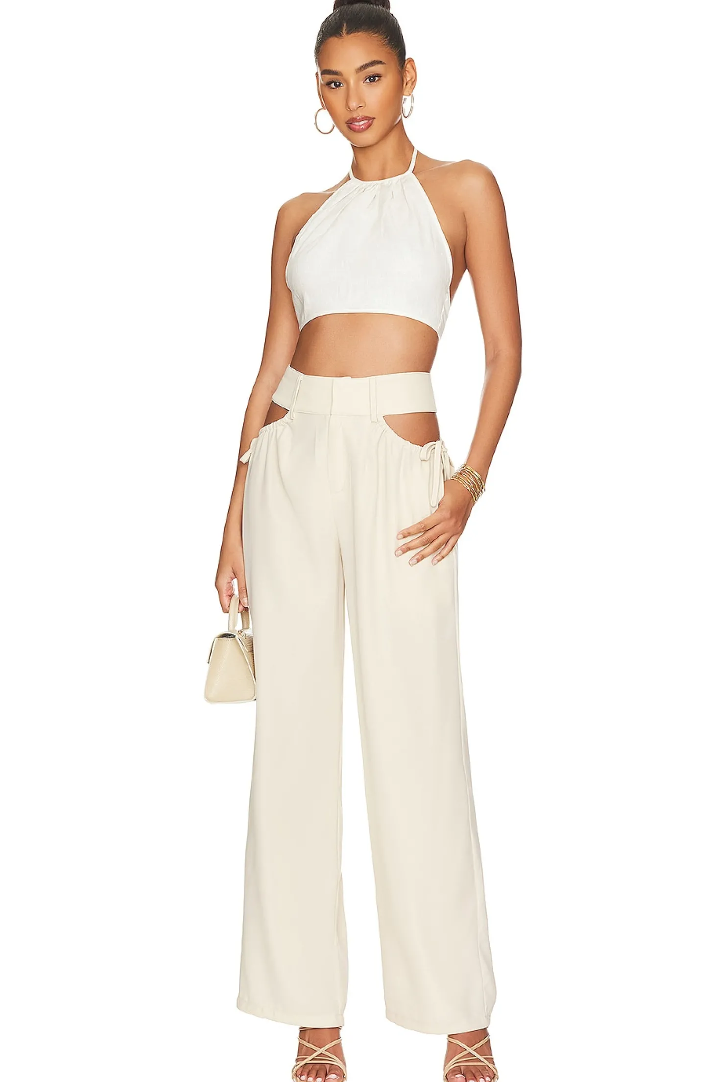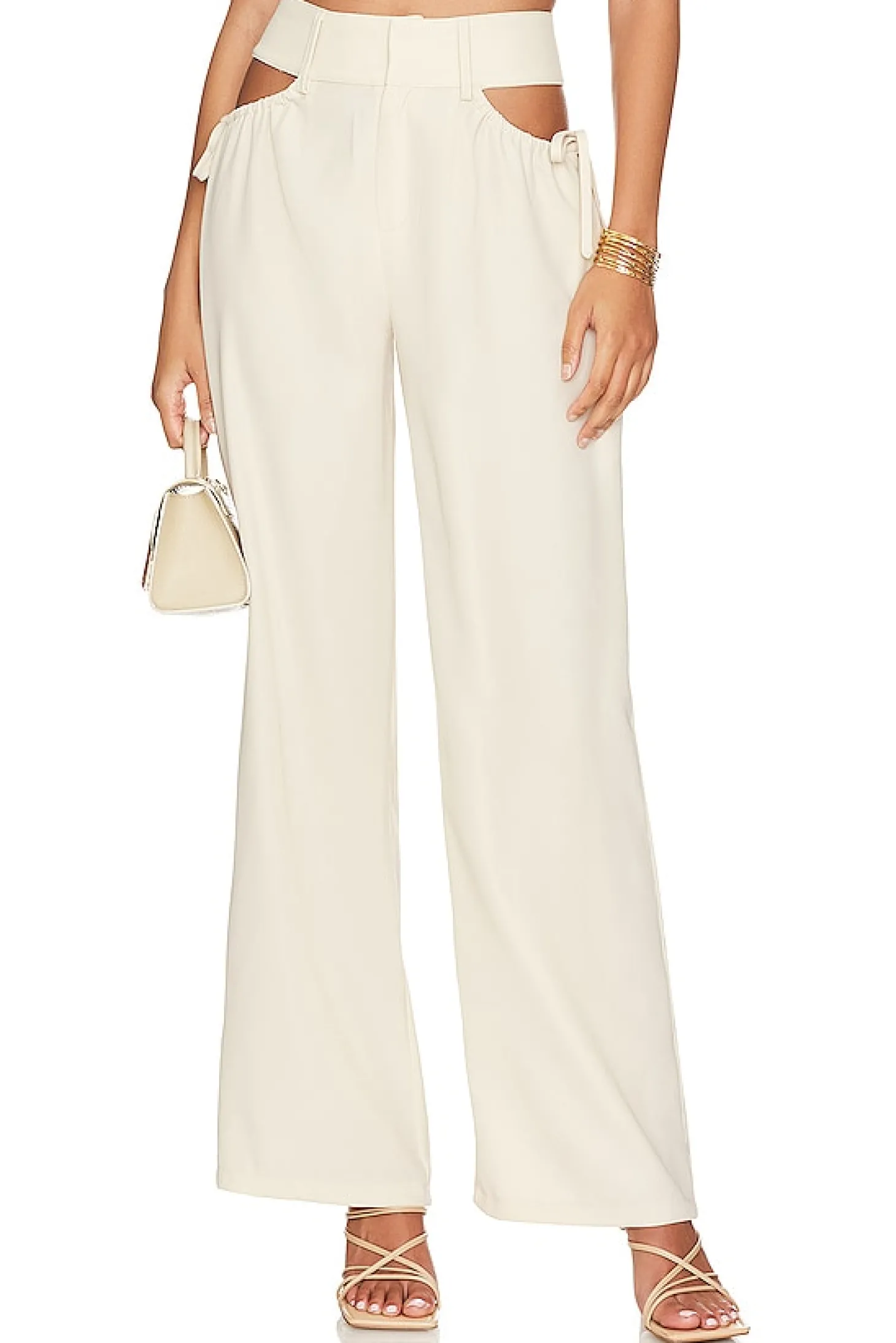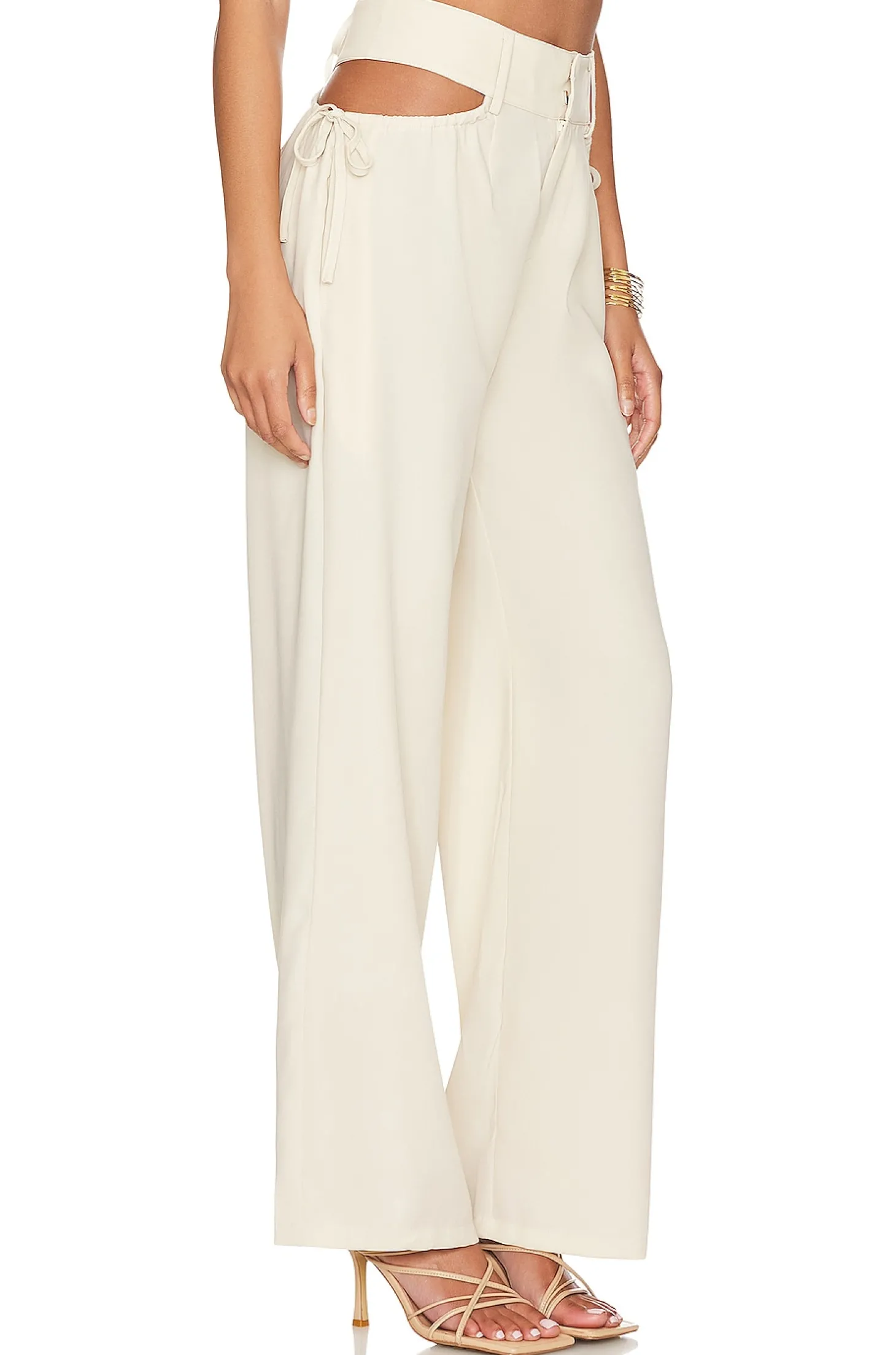 100% polyester.Made in China.Hand wash.Zip fly with hook and bar closure.Hip cut-outs with tie detail.Lightweight crepe fabric.20" at the knee and 20" at the leg opening