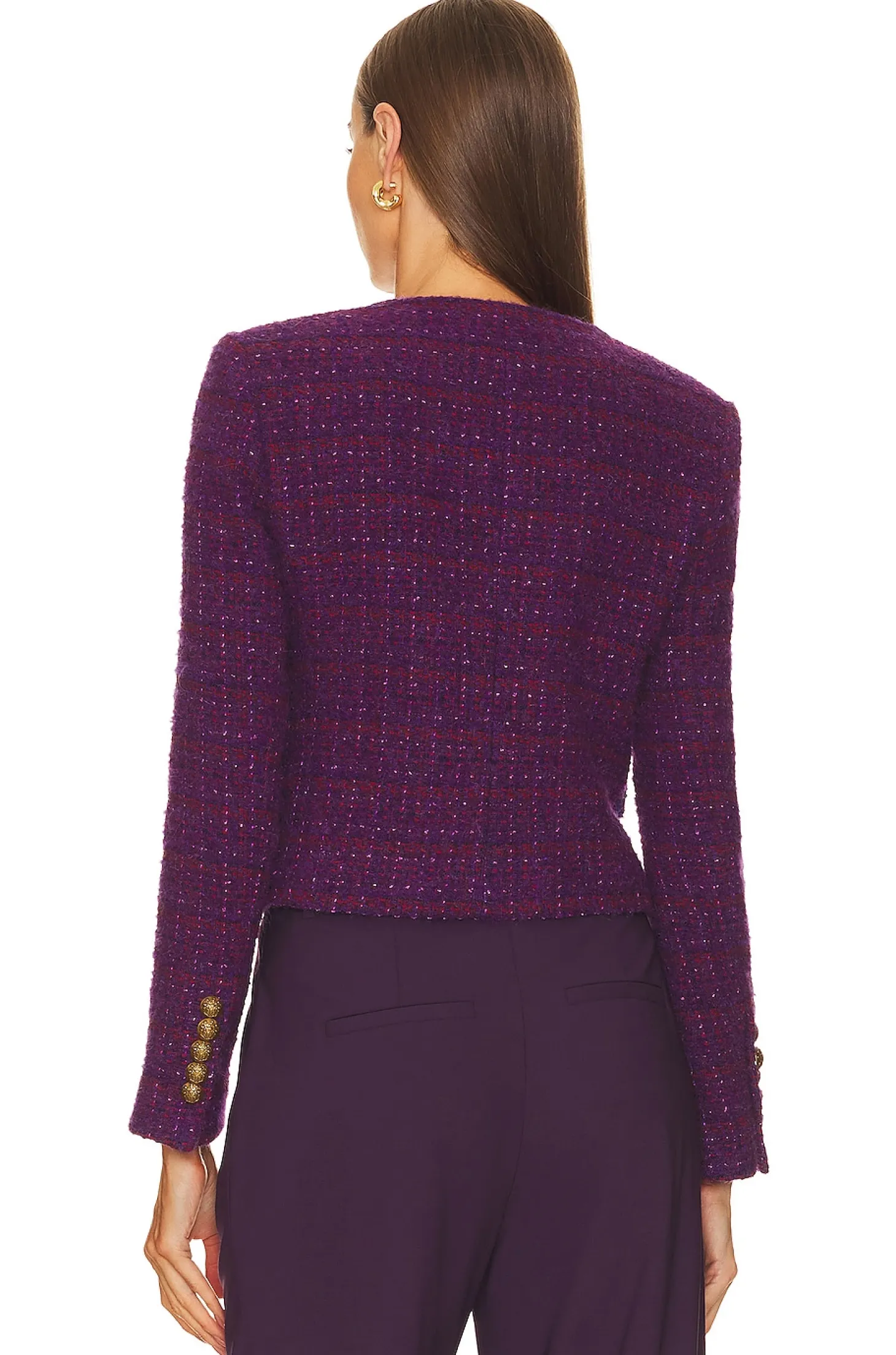 Acrylic blend.Imported.Dry clean recommended.Front button closure.Lightly padded shoulders.Front faux flap pockets.Midweight tweed knit fabric