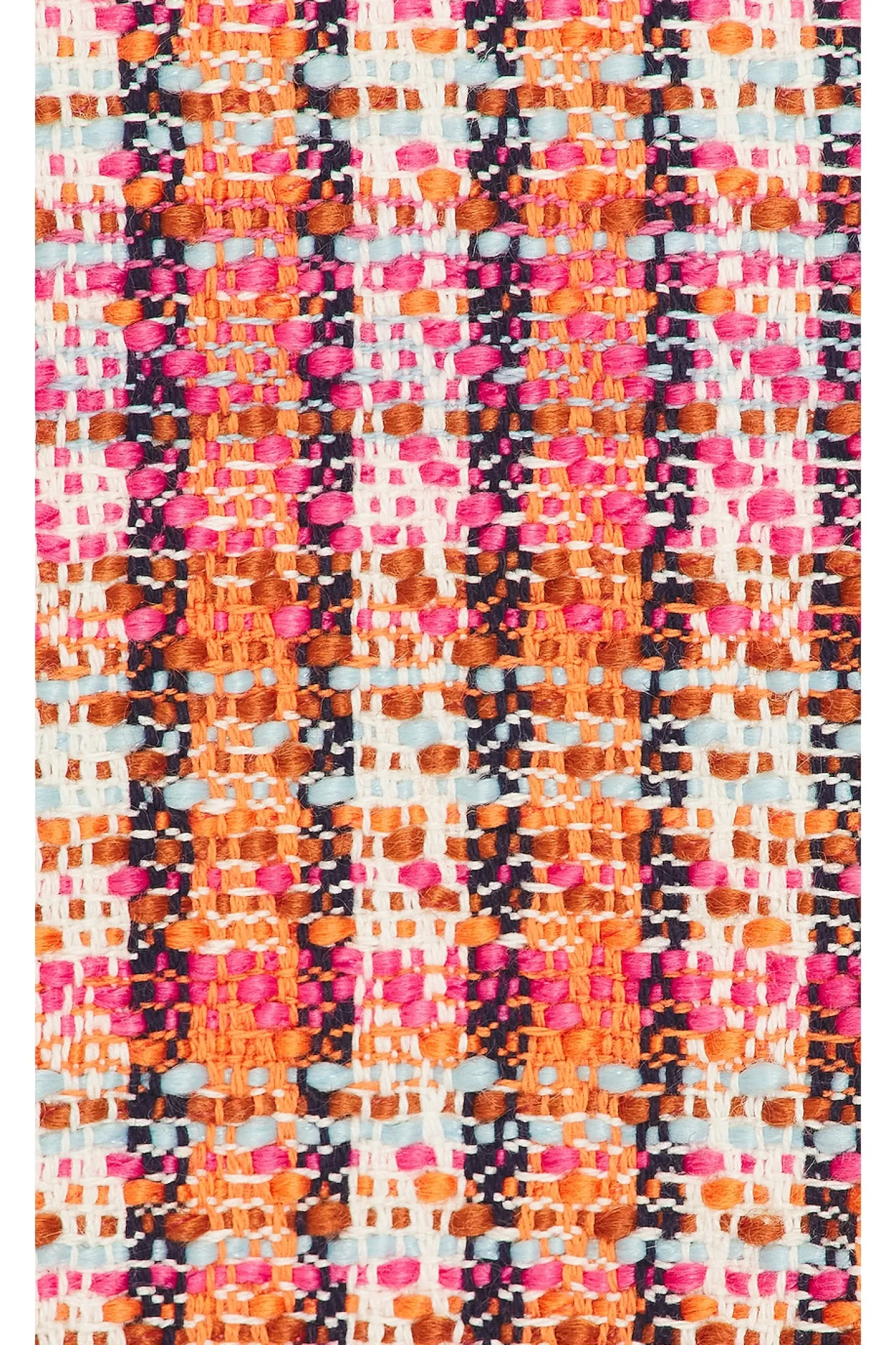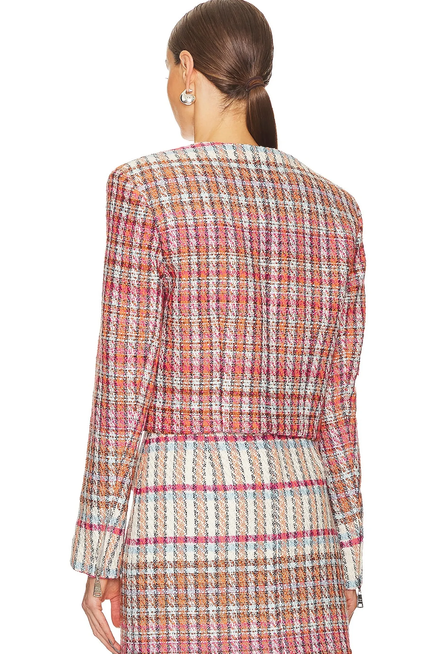 Shell: 58% cotton 20% wool 20% acrylic 2% polyester Lining: 55% polyester 45% viscose .Made in China.Dry clean recommended.Front zipper closure.Padded shoulders.Breast flap pockets.Zipper cuffs.Midweight tweed fabric