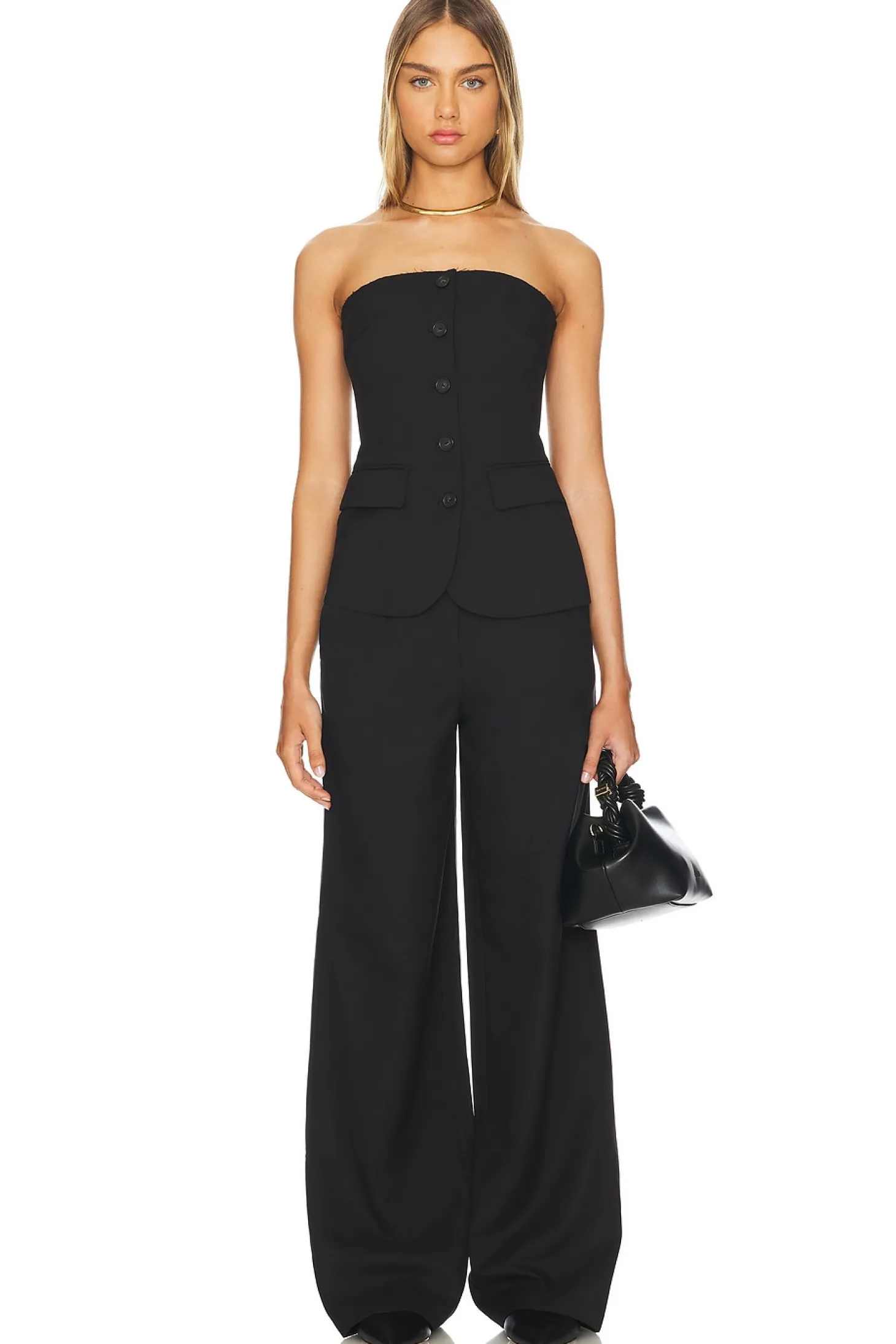 54% polyester 24% viscose 20% wool 2% elastane.Made in China.Dry clean.Zip fly with snap button closure.Side pockets.Raw cut waistband.Item not sold as a set.22" at the knee and 22" at the leg opening