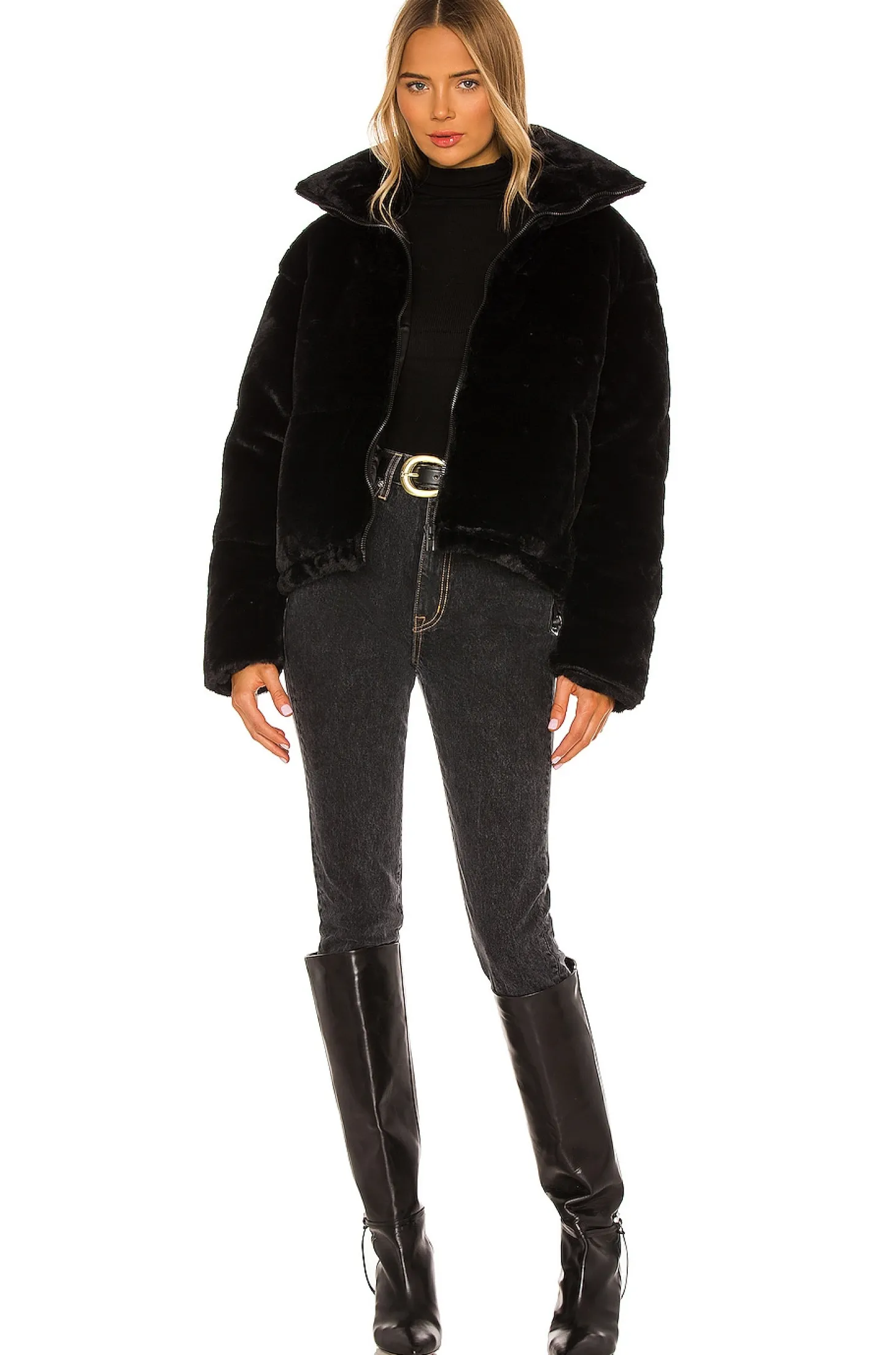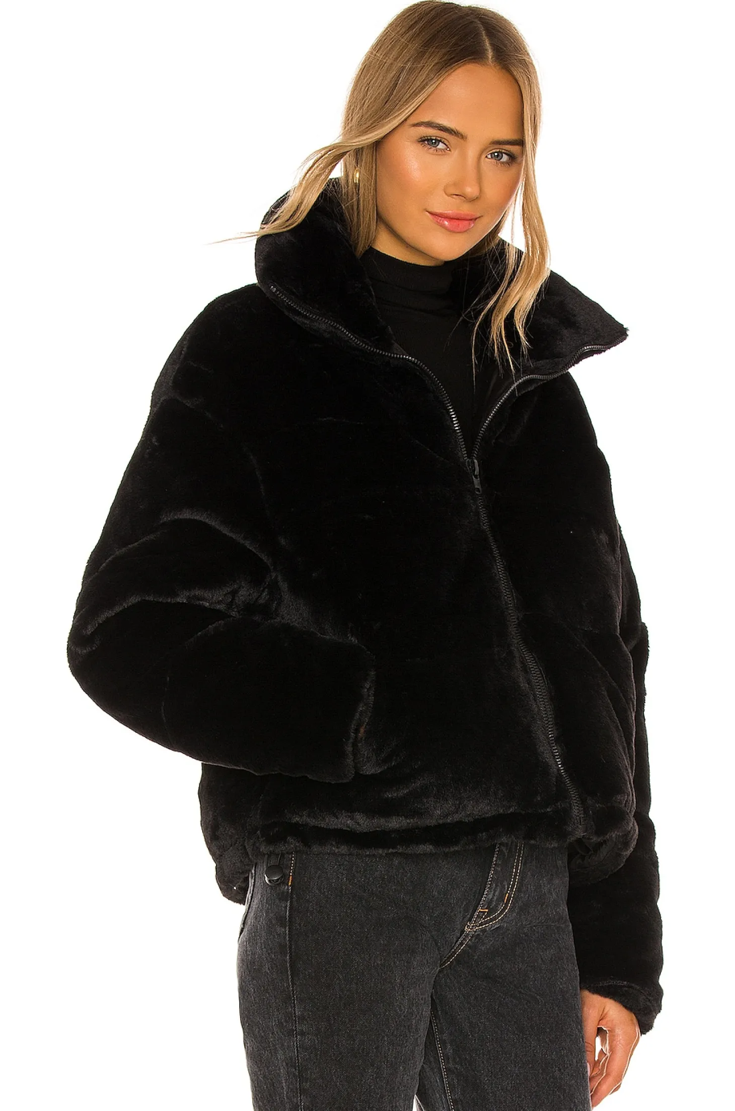 100% poly.Dry clean only.Front zipper closure.Side seam pockets.Pull-cord hem.Faux fur.Imported