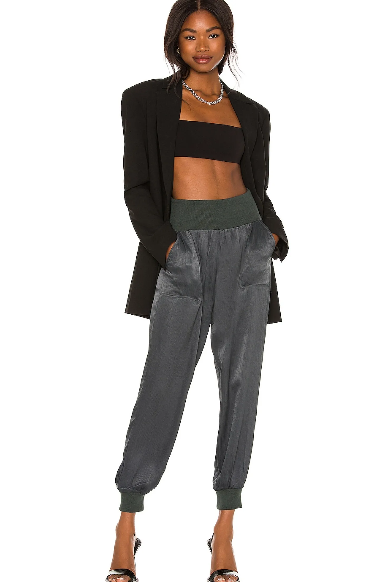 80% rayon 20% viscose.Made in China.Hand wash.Ribbed knit waist and hem.Front and back pockets.Textured satin fabric.19" at the knee narrows to 9" at the leg opening