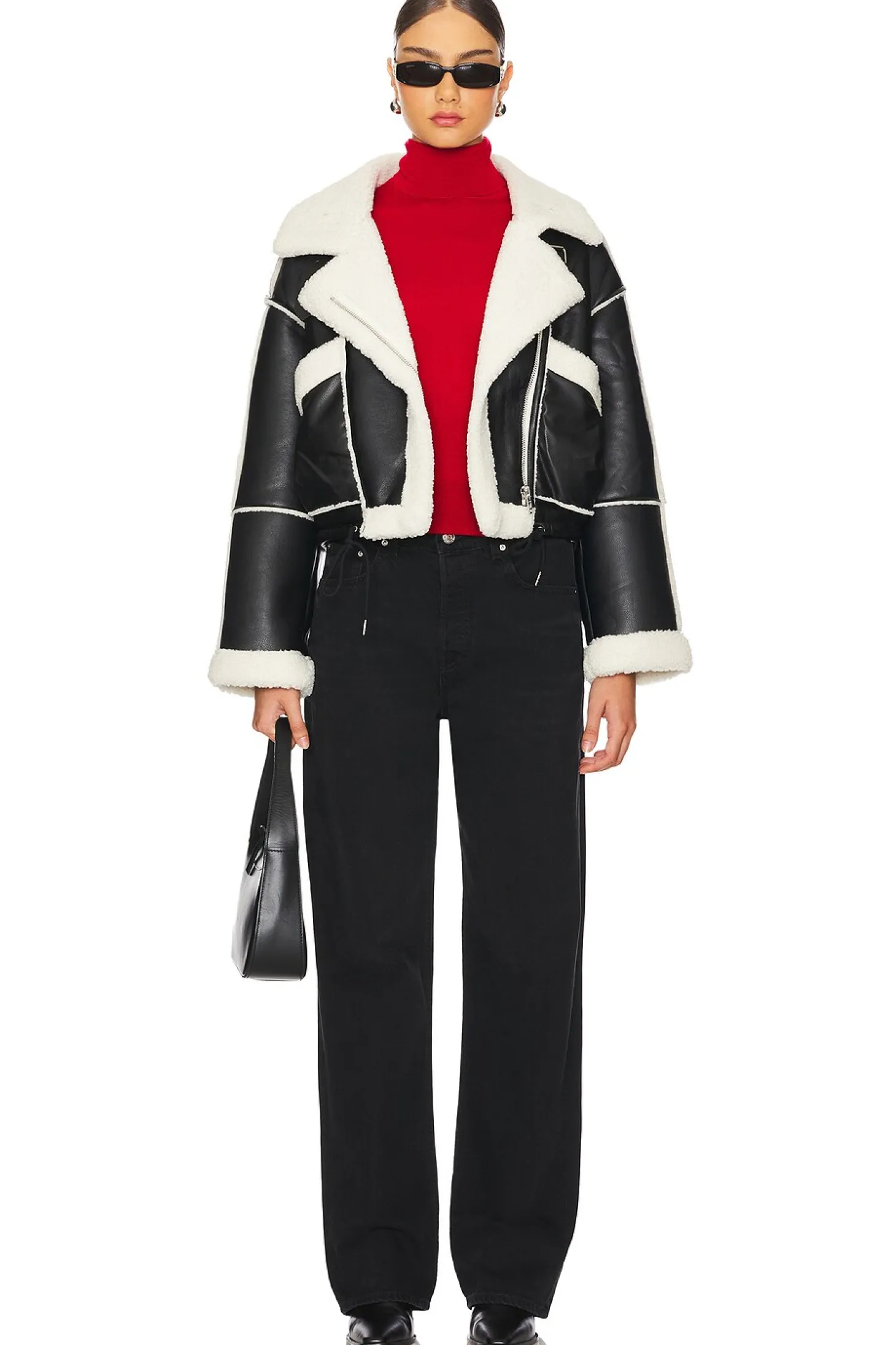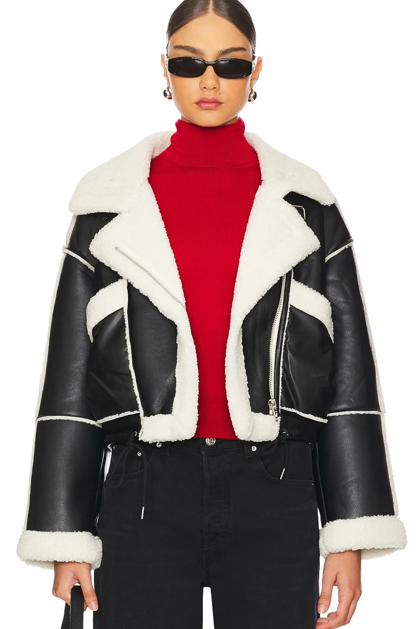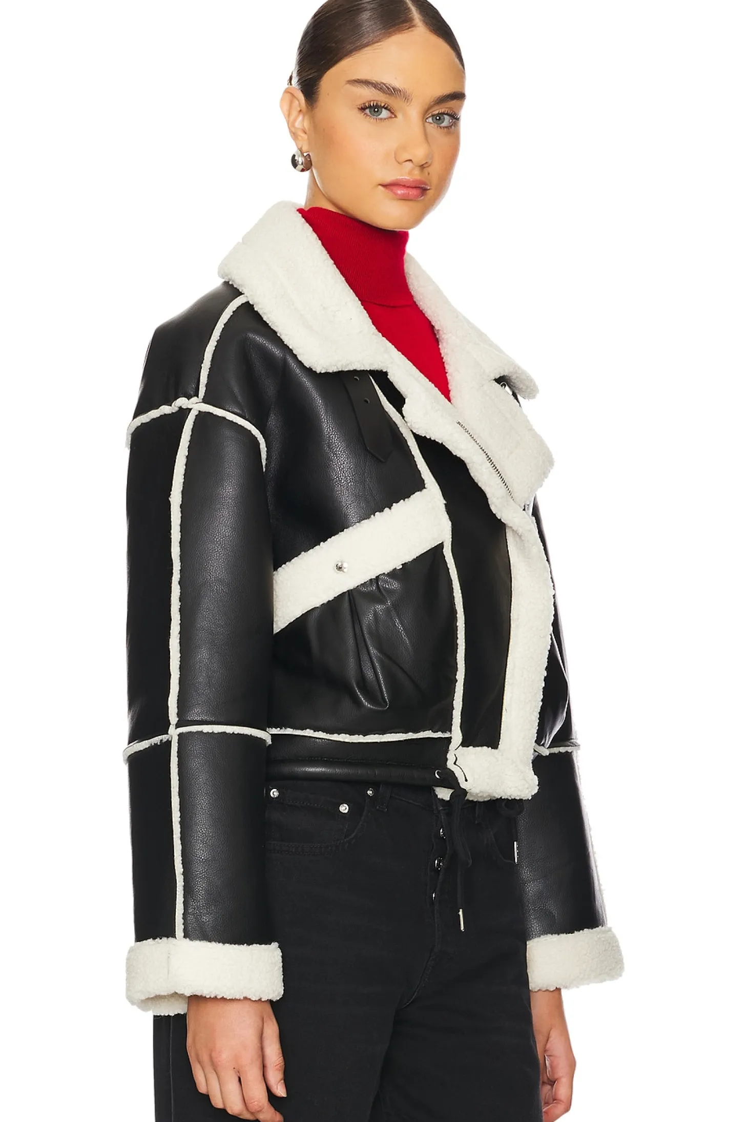 Self: 55% polyurethane 45% polyester Faux Fur Lining: 100% polyester.Made in China.Wipe clean.Hidden front zipper closure.Front pockets with snap button closure.Pull-cord waistband.Adjustable belt at collar.Faux leather and sherpa lining